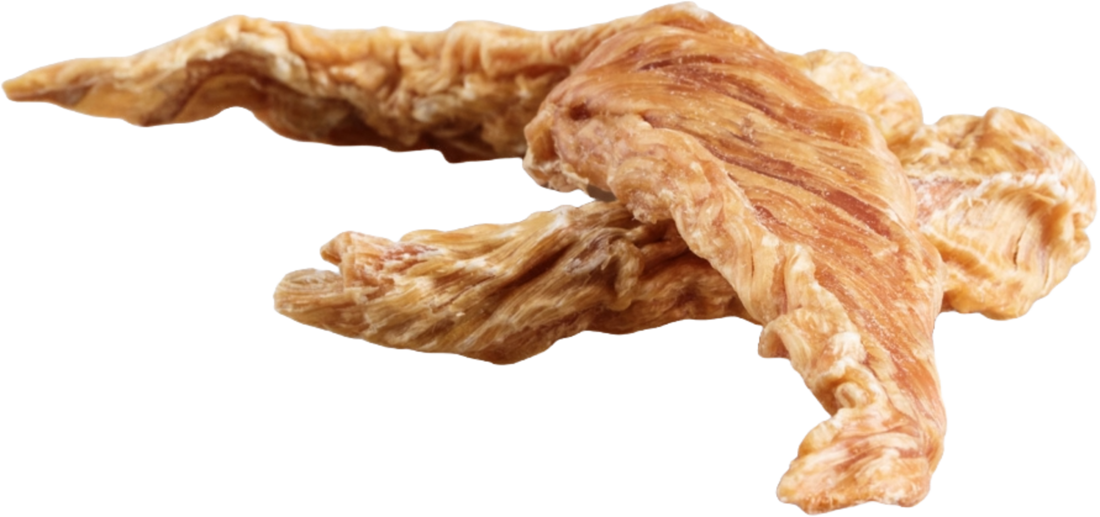 These gently dried chicken tenderloin fillet strips are a fantastic source of protein. They consist of 100% pure chicken tenderloin fillet and nothing else.