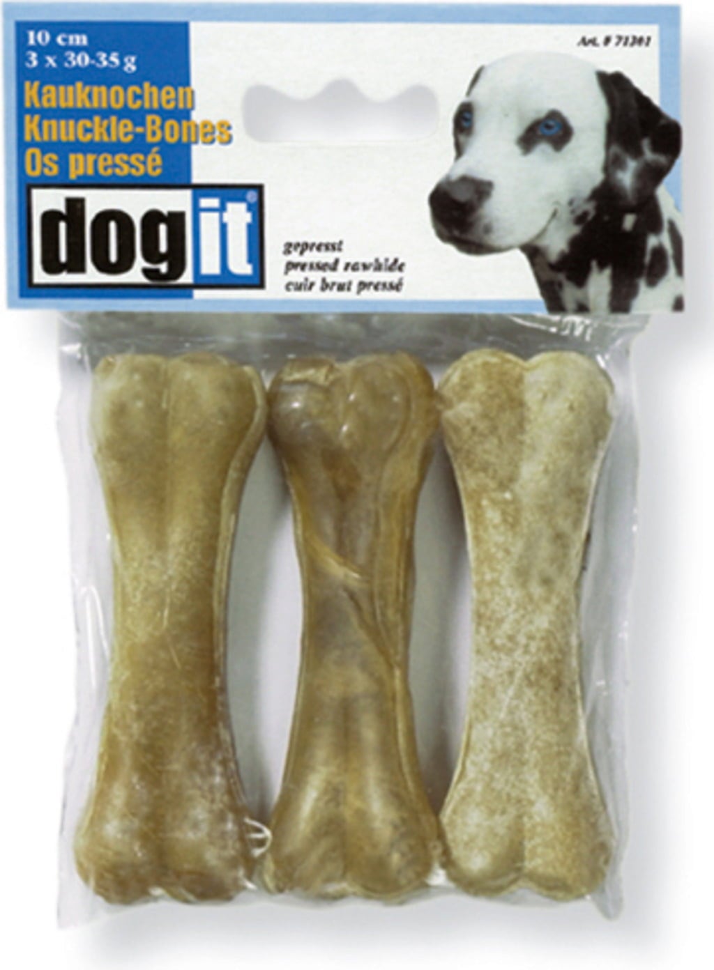 A pack contains 3 pieces. The chew bones are 10 cm long and weigh between 30 to 35 g.