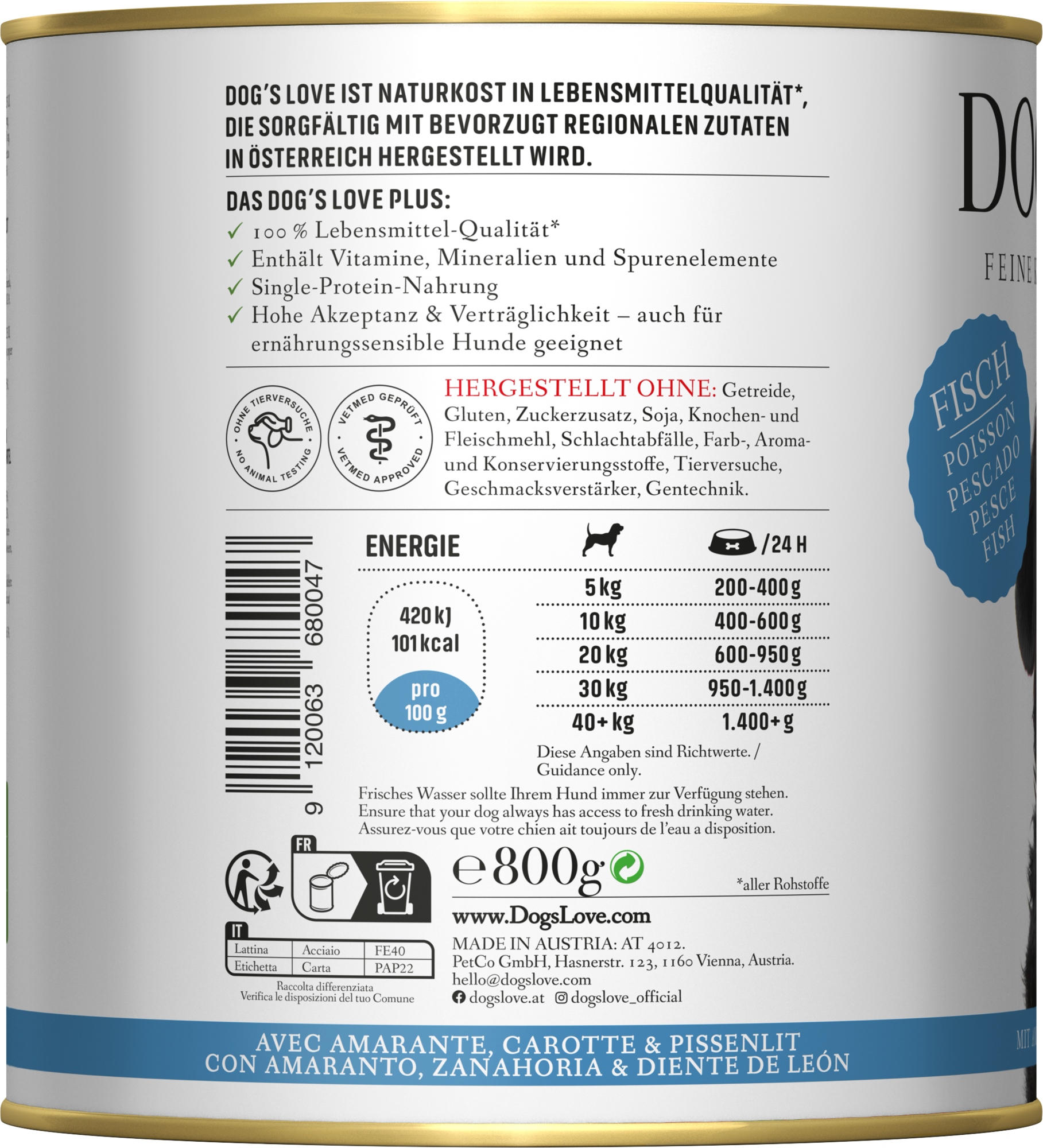 - For adult dogs100% human-grade qualityFish, amaranth, dandelion & carrotNo artificial additivesMade in Austria