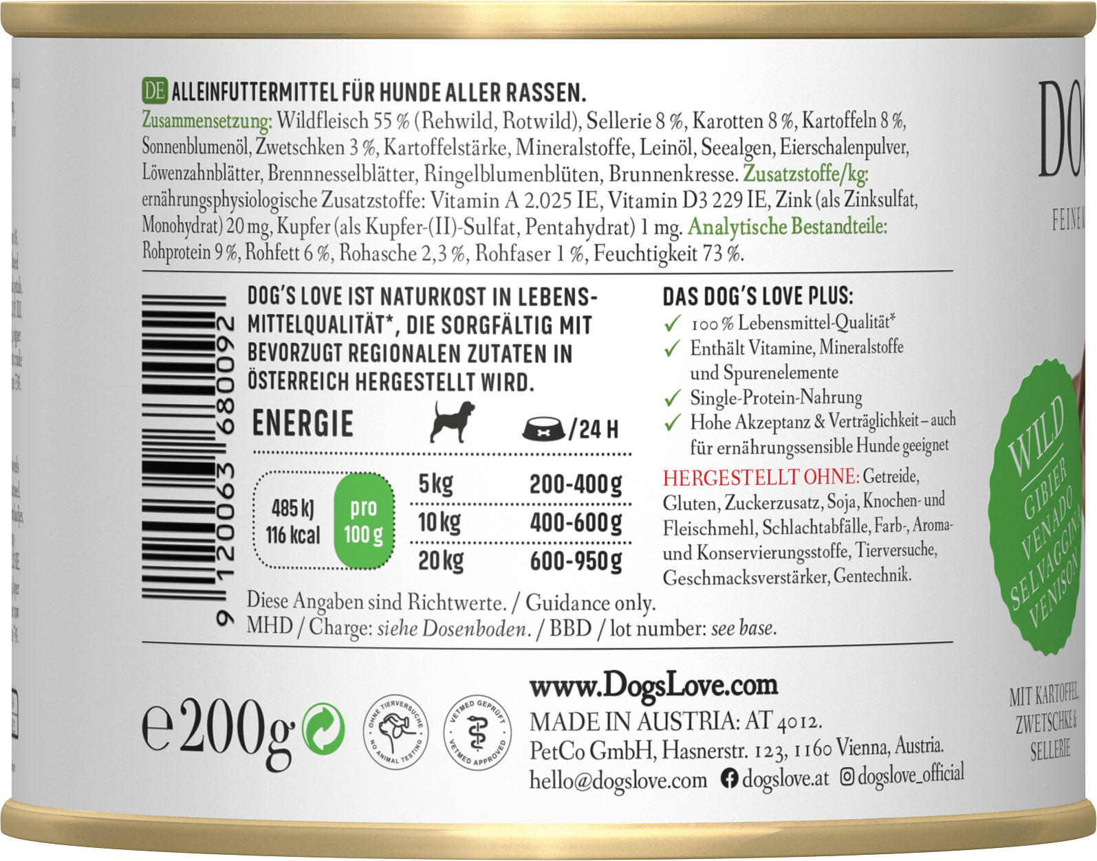 Are you searching for the perfect culinary delight for your dog? Look no further than Dog's Love Adult Wet Pet Food! Each bite is a symphony of high-quality, carefully selected ingredients that will satisfy even the most discerning palate. The tender texture of venison and roe venison (55%) combined with the fresh taste of potatoes, plums, and celery transforms every meal into a feast.
