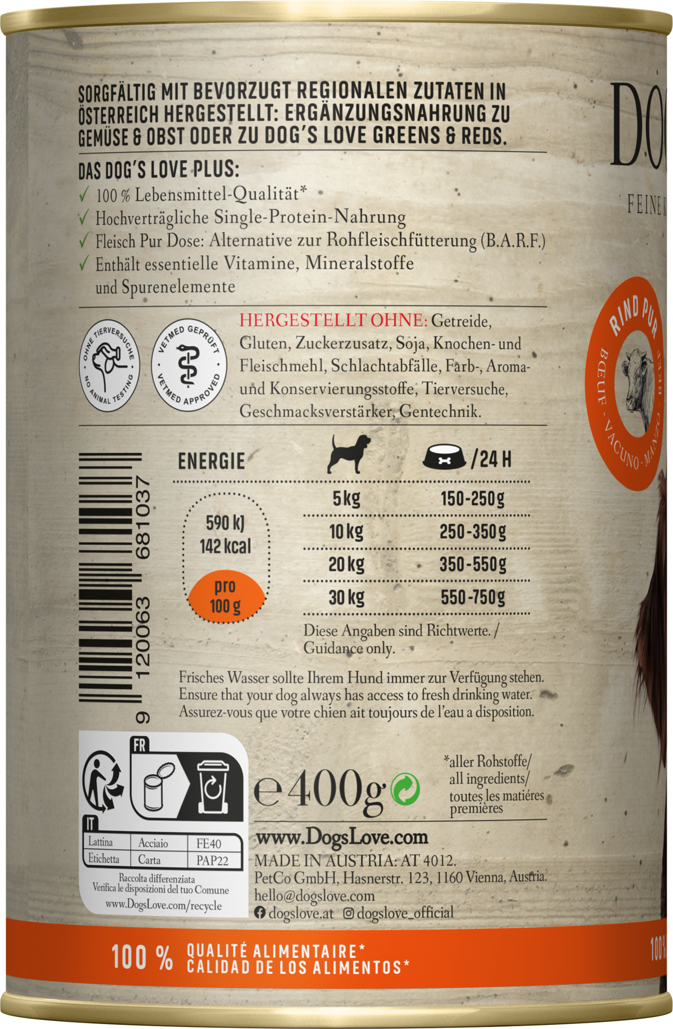 DOG'S LOVE Wet Dog Food BARF BEEF, 400 g