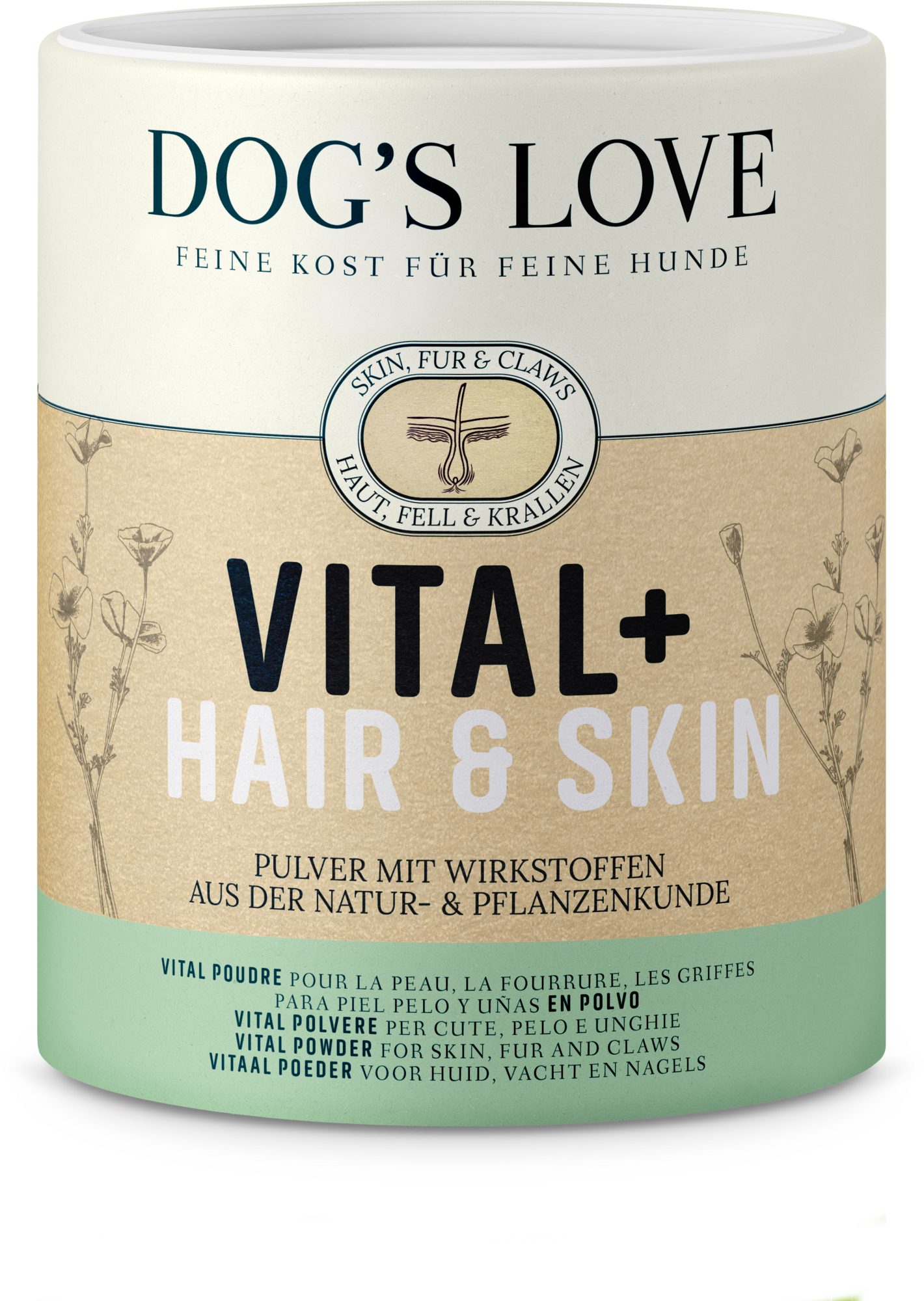 This valuable Vital Hair & Skin Powder by Dog's Love is a supplement that can support the claws, skin, and coat of dogs. The powder contains premium active ingredients from natural and herbal medicine, and avoids the addition of gluten, sugar, purines, cholesterol, colourings, and flavourings.