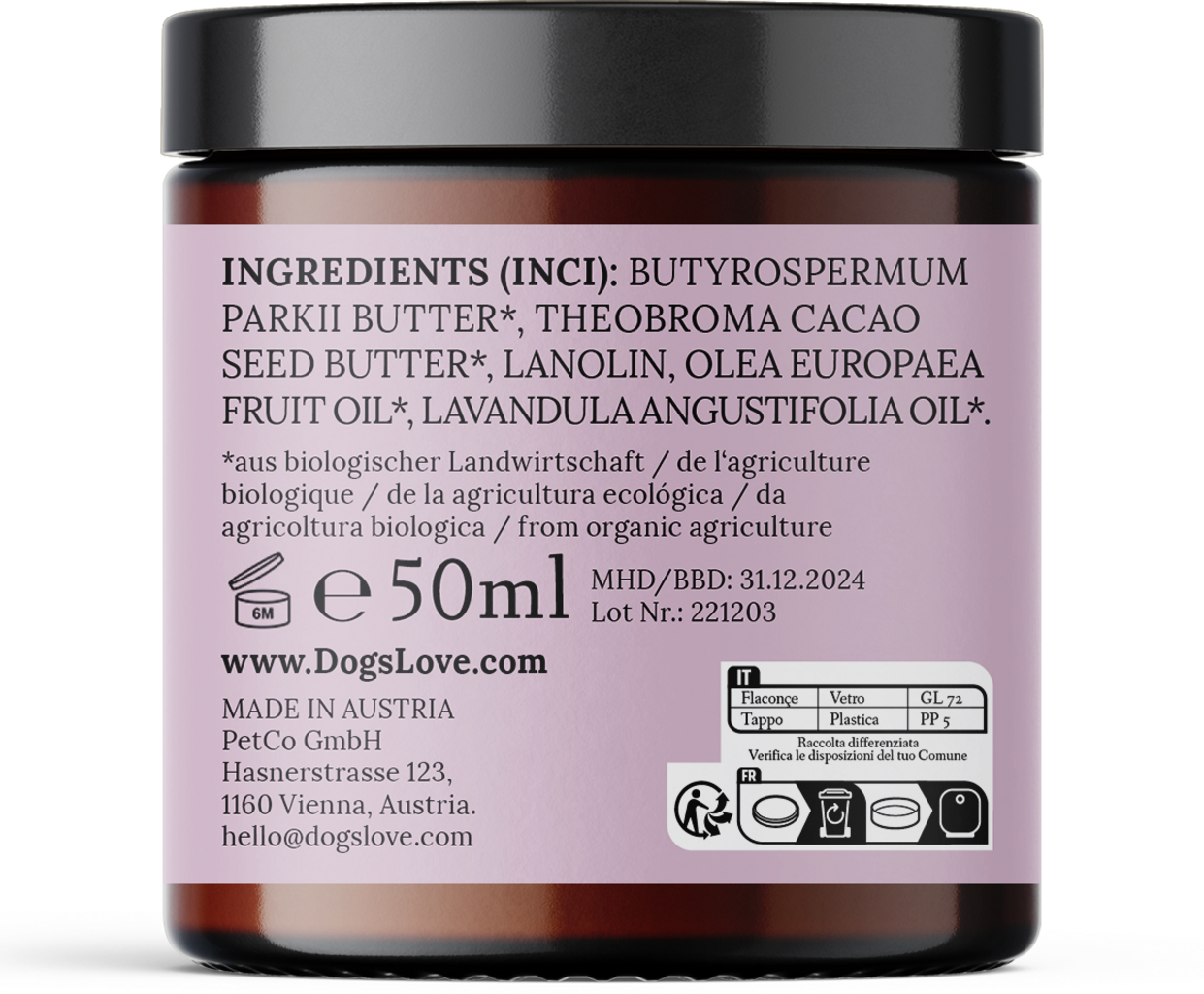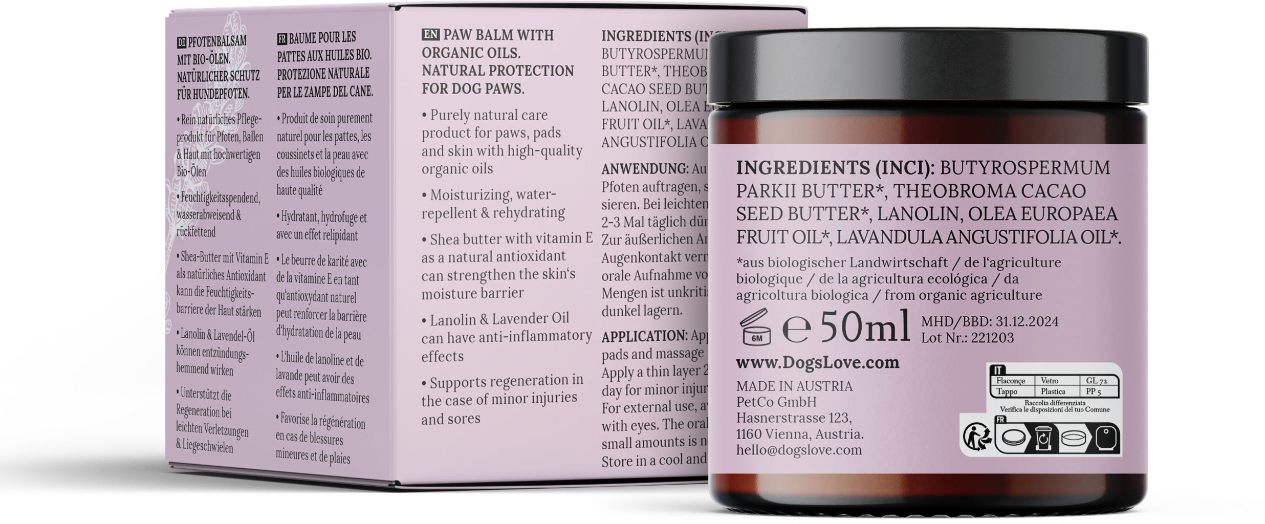 Natural Balm by Dog's Love has been specially developed to protect your pet's sensitive paws from the daily rigours of life. This gentle paw balm is made from natural ingredients sourced from organic farming and enriched with valuable organic oils.