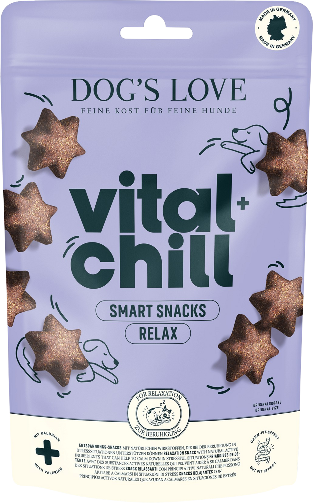 The tasty Vital + Chill Smart Snacks by DOGS'S LOVE contain chamomile flowers, eschscholzia californica, valerian, hops, ginger and L-tryptophan. They can contribute to a relaxed general condition and thus provide optimal support in stressful situations in daily life. The recipe is free from added sugar, gluten, artificial colours and flavours.