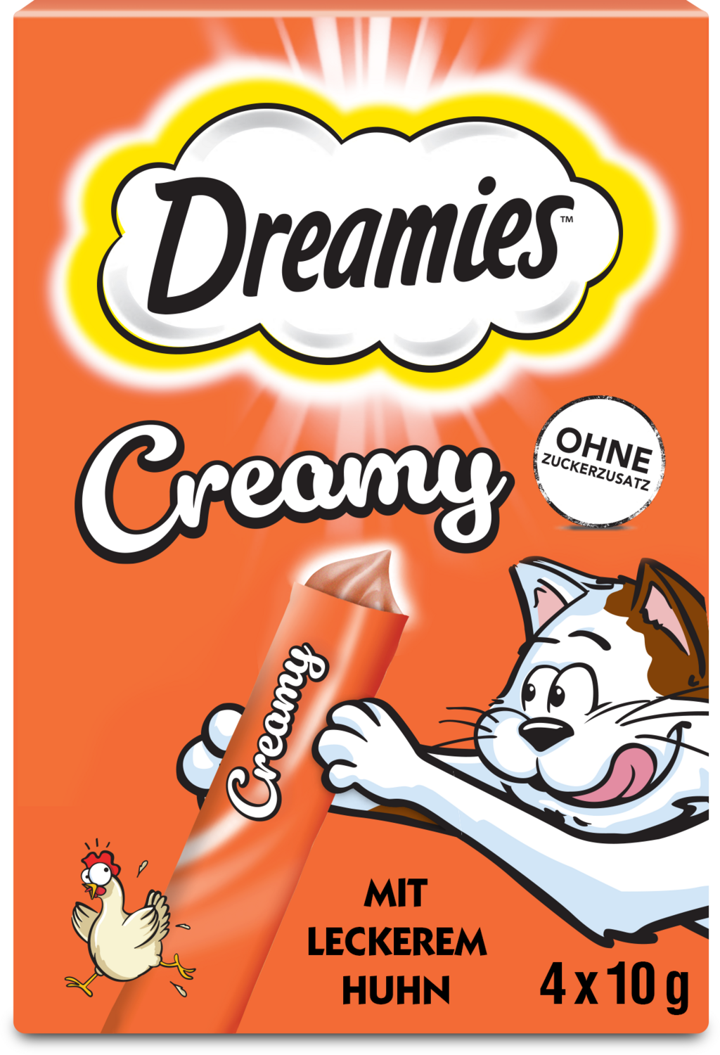 Does your cat love snacks? With Dreamies Creamy Chicken, you'll certainly surprise them. The handy tear-open stick sachets contain an irresistible cream for licking. The recipe is rich and tasty, and also contains taurine - ideal for playful or adventurous cats.