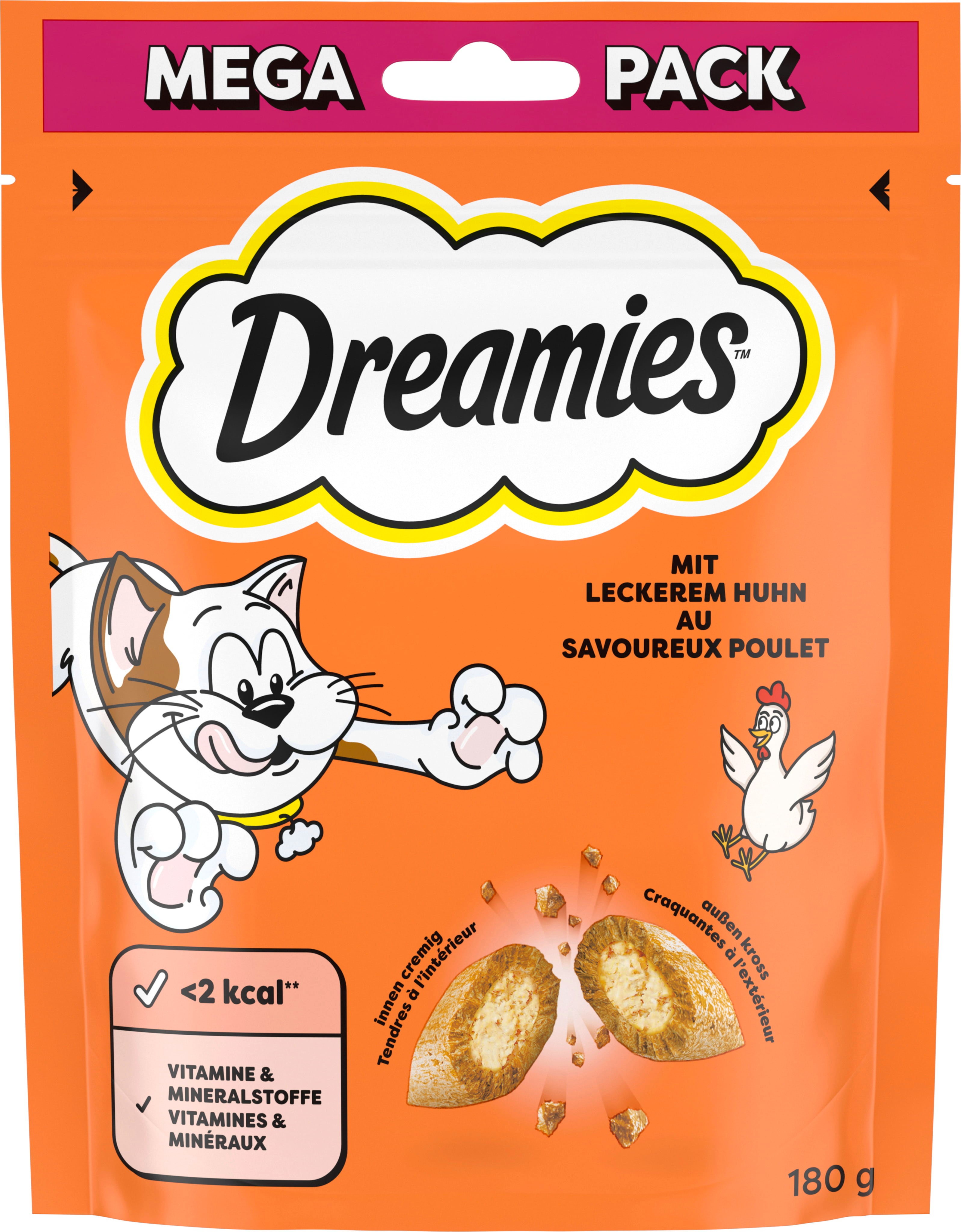 Do you want to reward your cat especially? Dreamies Chicken are crisp baked snacks, filled with an irresistibly creamy chicken filling. The recipe includes carefully selected ingredients and valuable additions such as antioxidants, vitamins and minerals. The Mega-Pack contains 180 g of Dreamies - ideal for households with multiple cats.