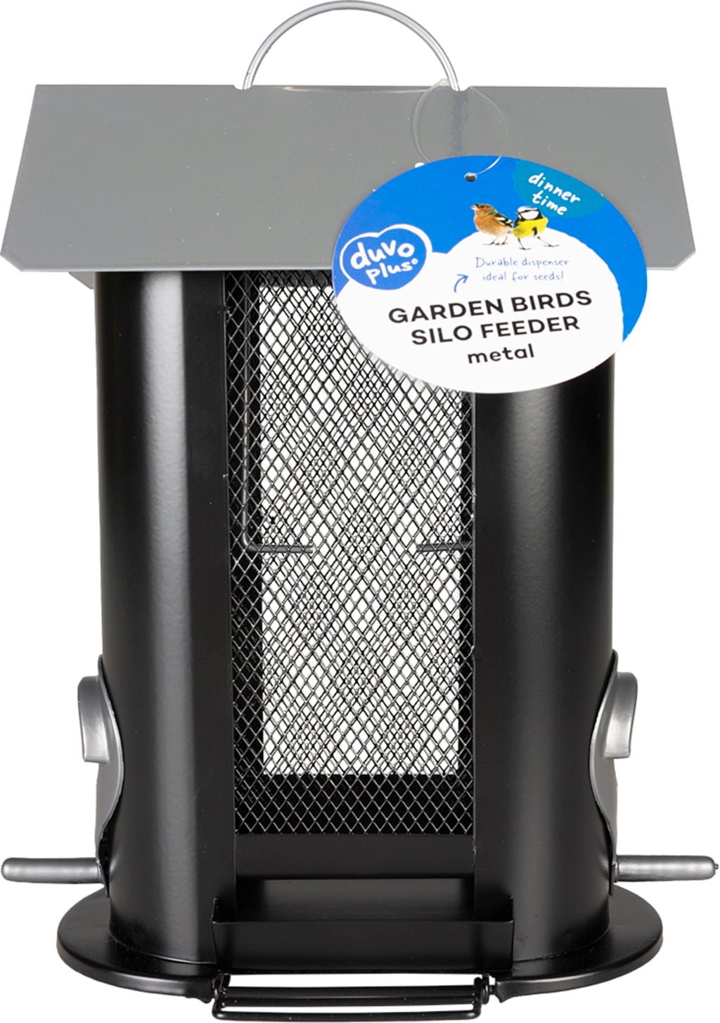 The Metal Feed Dispenser for Nuts by duvoplus is a bird feeder made of robust metal for feeding garden birds all year round. The easy-to-fill grid silo with its functional design is intended for filling with nuts. It has three openings, two feeding bowls, a perch and a stand that provides a stable place for birds to land. An integrated hook makes it easy to hang it up in a convenient spot.
