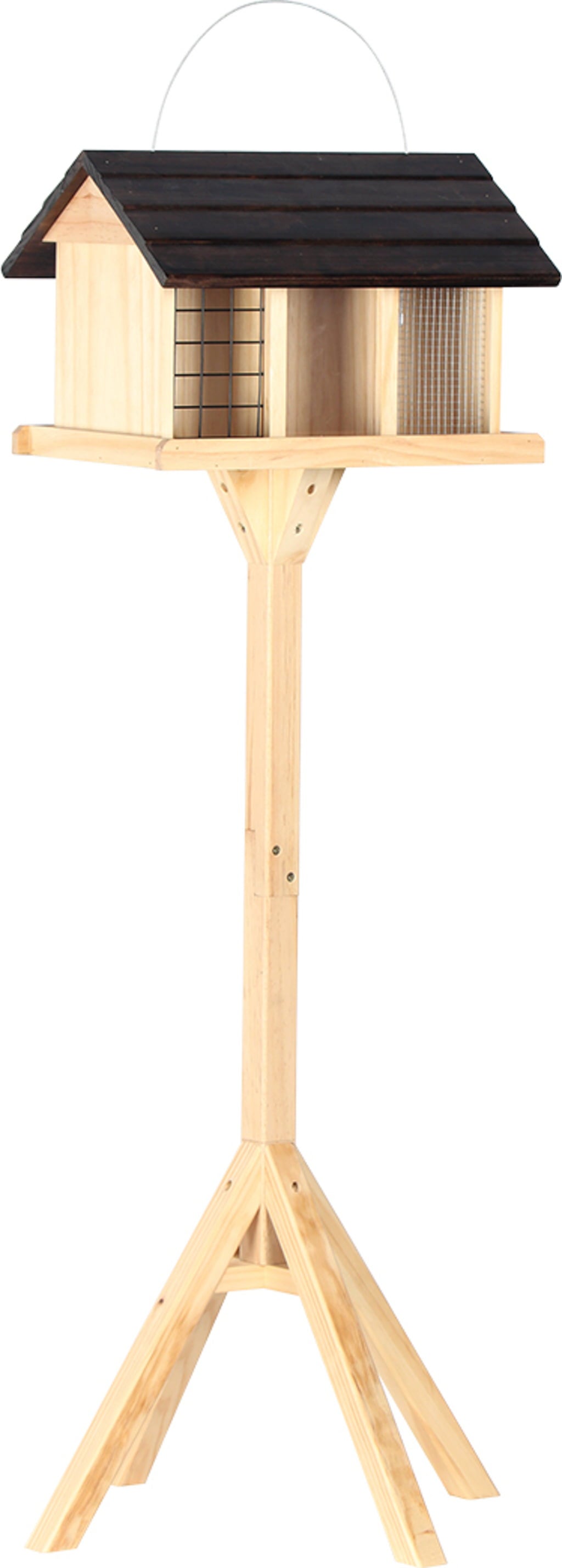 The easiest way to attract more birds to your garden is by providing them with nutritious food sources. The Modena Garden Bird Feeder by duvoplus is a weather-resistant wooden feeder on an elevated stand. This sturdy model features three different feeding compartments designed to be filled with different of bird food, allowing hungry birds to choose their preferred food. The compartments include a coarse net for suet balls, a plexiglass container for seeds, and a fine net for nuts. The food can be easily refilled via the hinged roof.