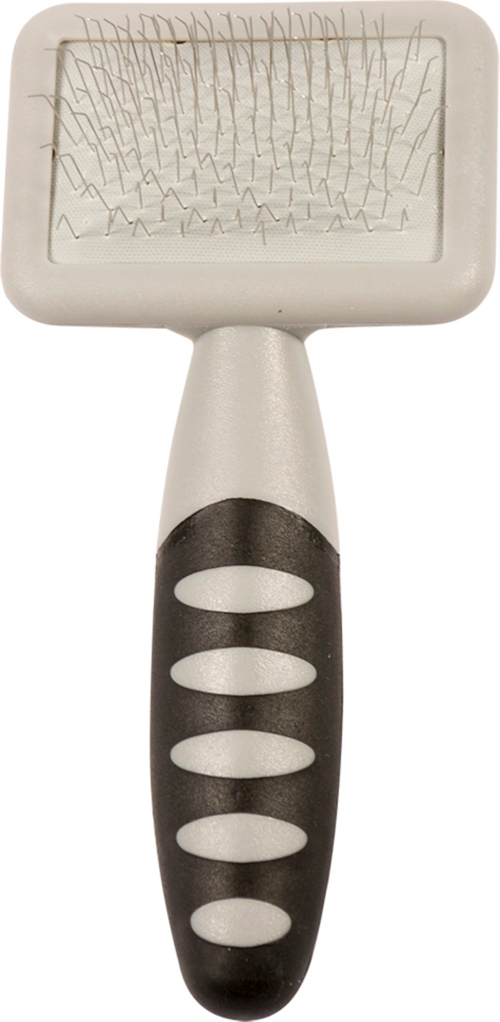 The bristles of the slicker brush are variously shaped and face different directions: While some bristles are straight, others are curved, allowing the impact to be altered as your brush. The brush is very comfortable to hold and use so both human and pet can enjoy a relaxed grooming session!