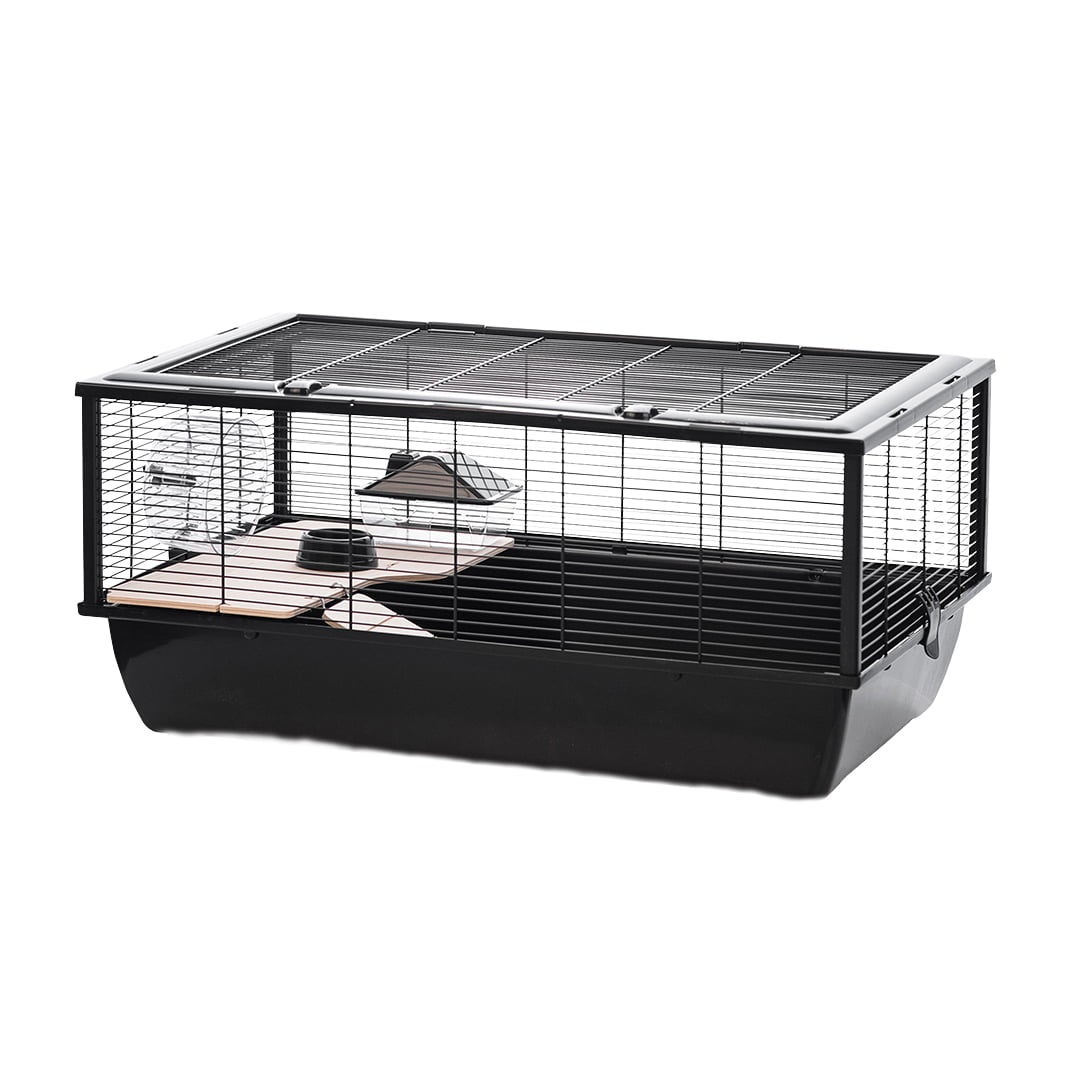 This cage for hamsters and mice excels in quality, design, and comfort. It is equipped with a wooden platform and ladder, as well as stylish accessories.
