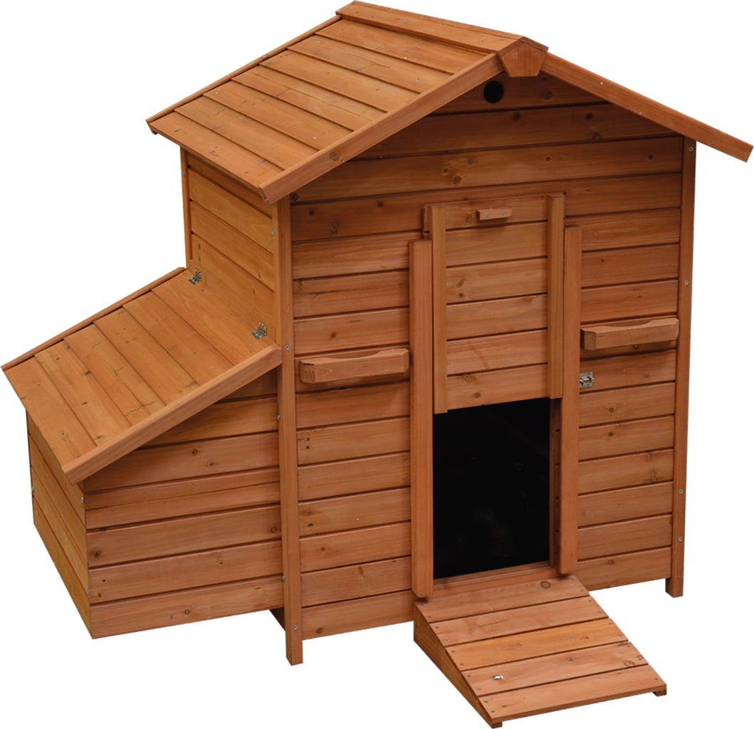 The Woodland Emmy Chicken Coop provides space for 2 chickens to rest and nest. It features a nest box, a ramp, and a perch. The egg-laying area can be accessed through the top of the coop. There are 4 handles on the sides to allow for easy repositioning of the chicken coop if needed.