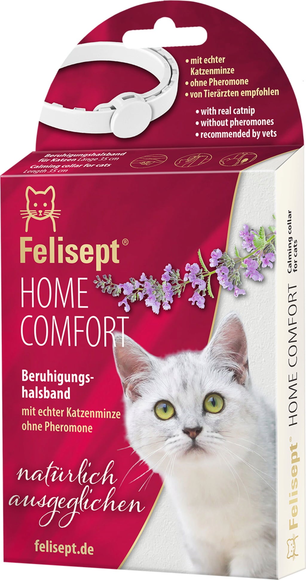 The Home Comfort Calming Collar by Felisept contains extract of real catnip embedded within a polymer matrix. The collar is activated upon opening the packaging and releases the scent of catnip for up to 30 days, which can help support your cat in stressful situations!
