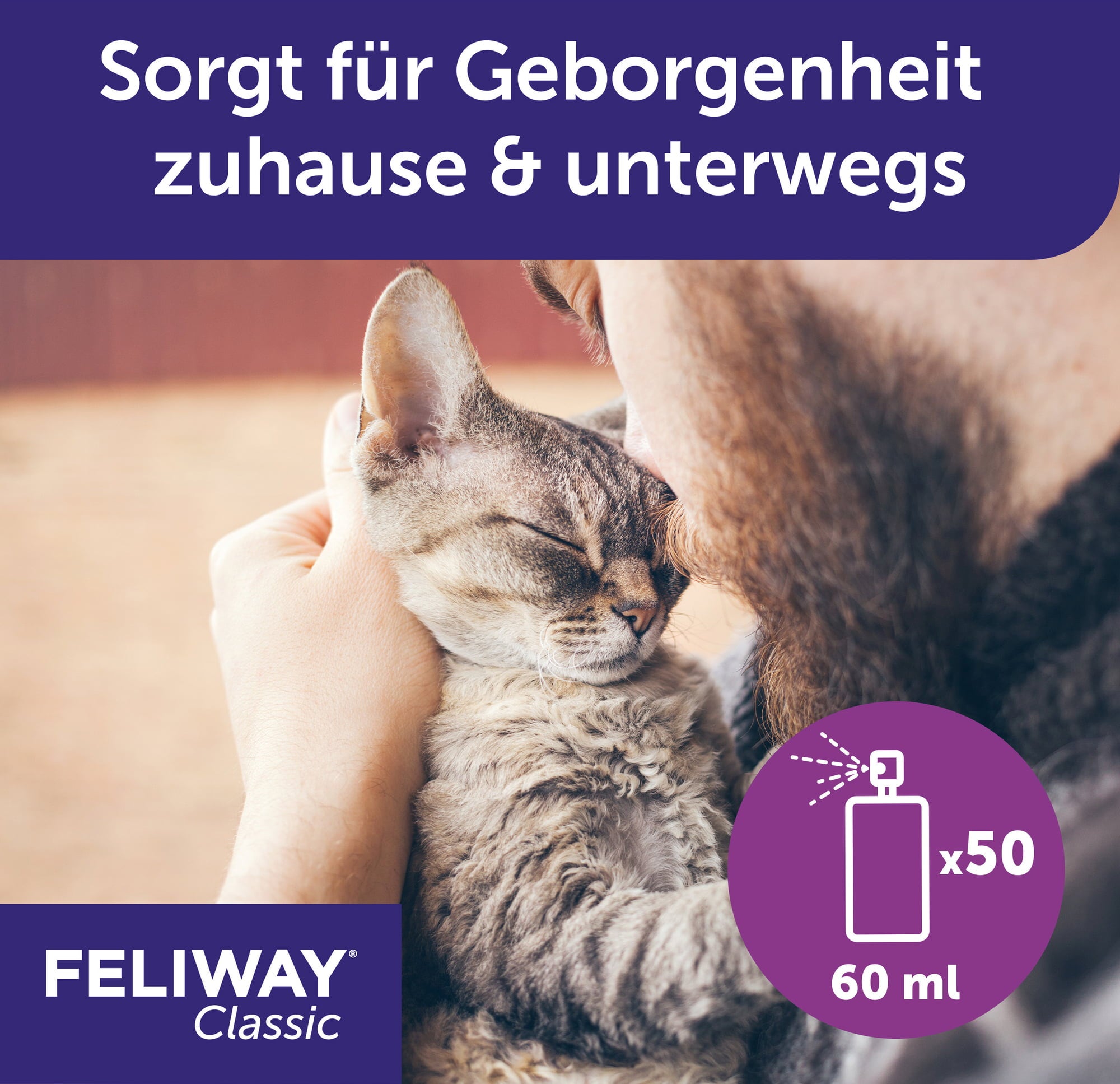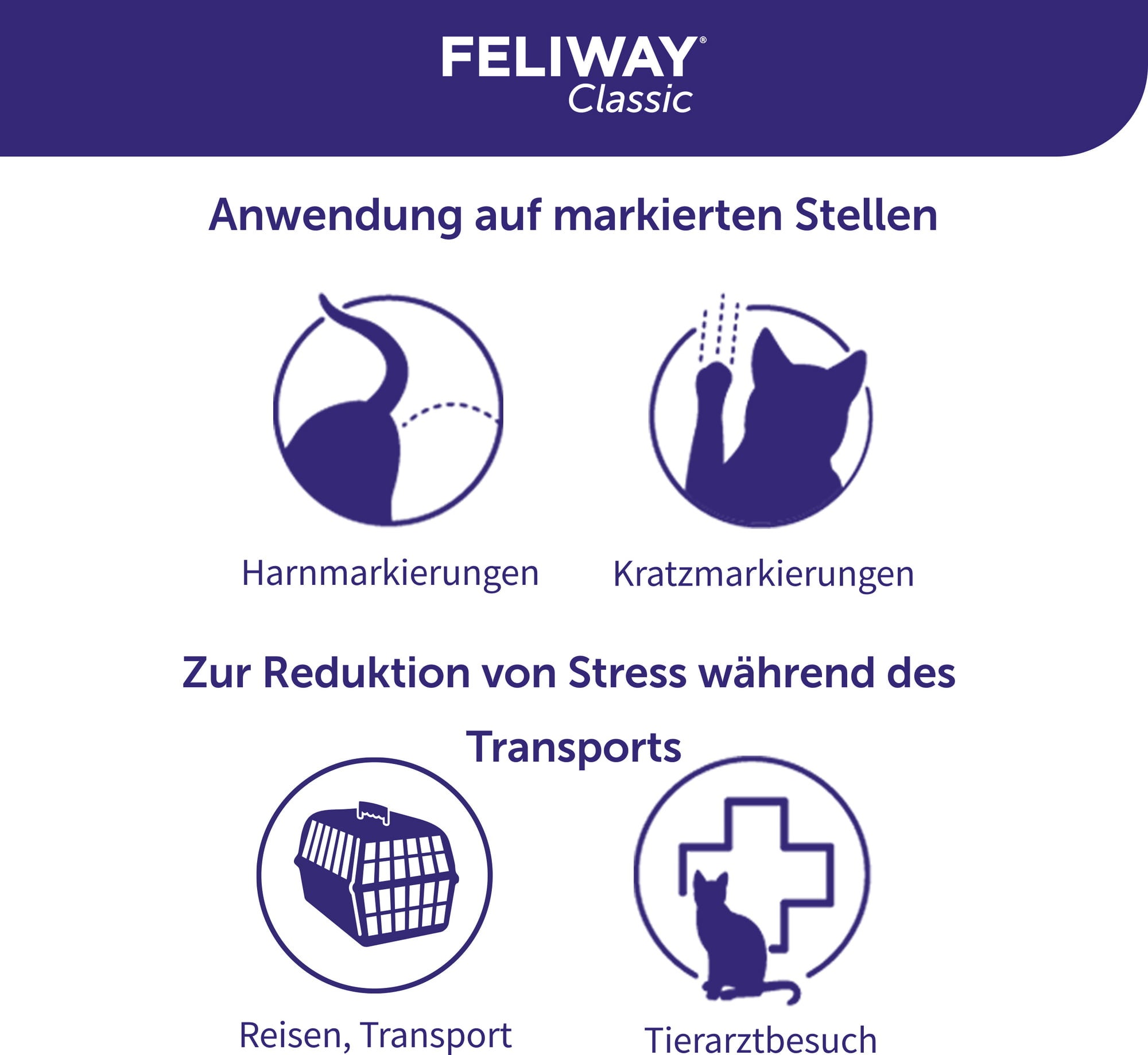 Clean areas marked with urine or scratch marks with warm water and soap. Spray these areas with the Classic Spray (about 1–2 times a day). Note that the cat should not approach the sprayed area for about 15 minutes.