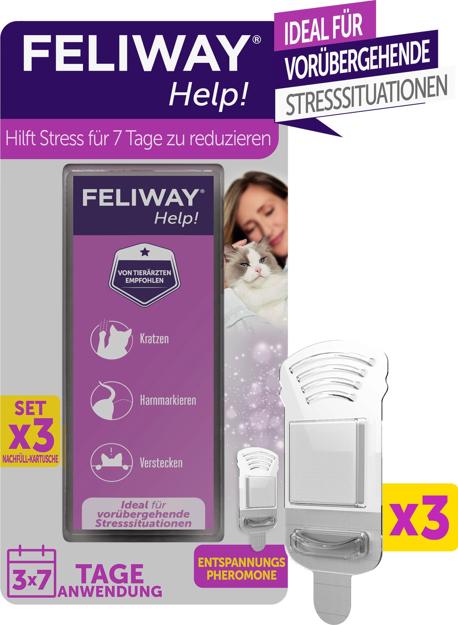The Feliway Help! 3x7 Day Value Pack comprises three refill cartridges with relaxing pheromones which can help reduce stress in cats and promote a sense of balance.