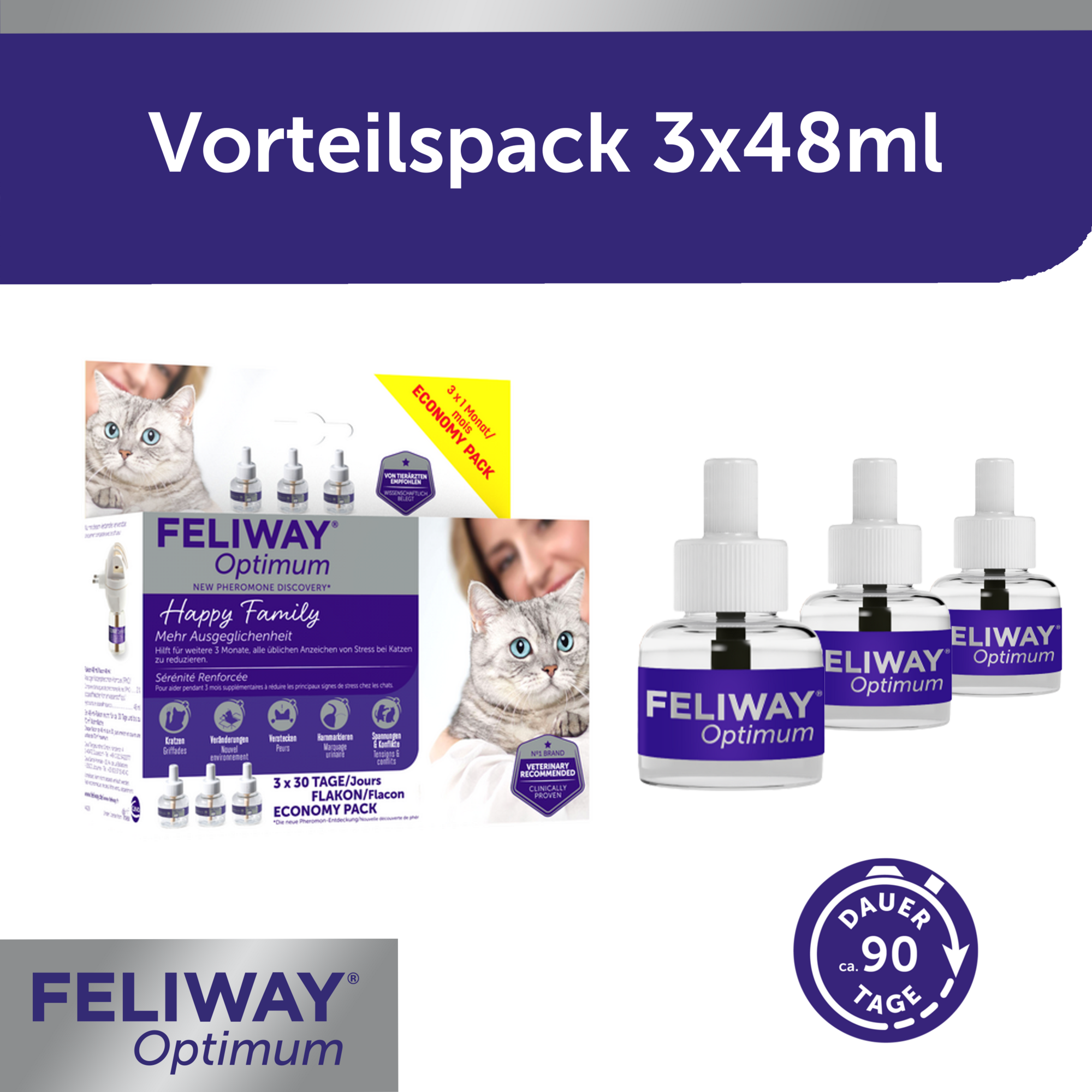 ► This value pack contains 3 Feliway Optimum bottles, each of 48 ml. One bottle lasts for 30 days.