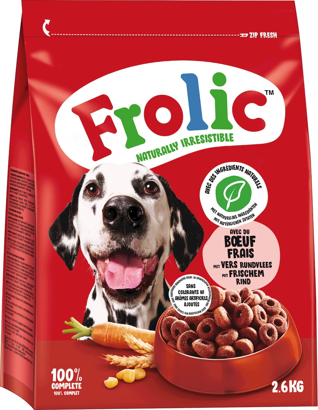 Dogs love Frolic! The tasty Frolic Complete is a balanced meal that contains everything your dog needs! This food is tailored to meet the needs of adult dogs, providing them with essential vitamins and minerals from carefully selected ingredients like protein-rich beef, delicious vegetables, and tasty wheat. This will help your dog stay full of energy throughout the day.