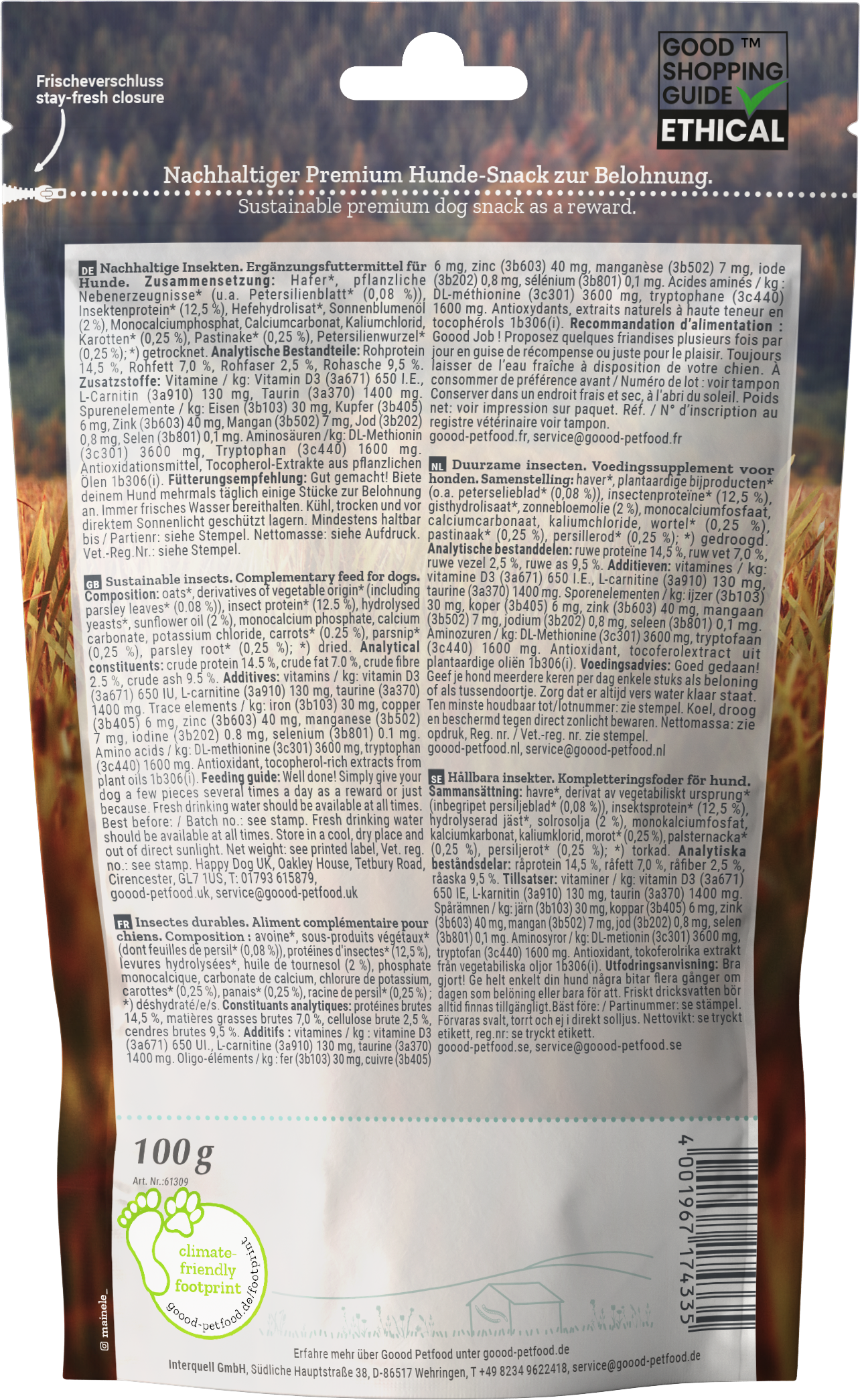 This premium dog snack contains only selected ingredients such as protein-rich, sustainably reared insects, oats, carrot, parsnip and parsley. Not is it incredibly delicious, but it also makes a valuable contribution to your dog's daily diet.