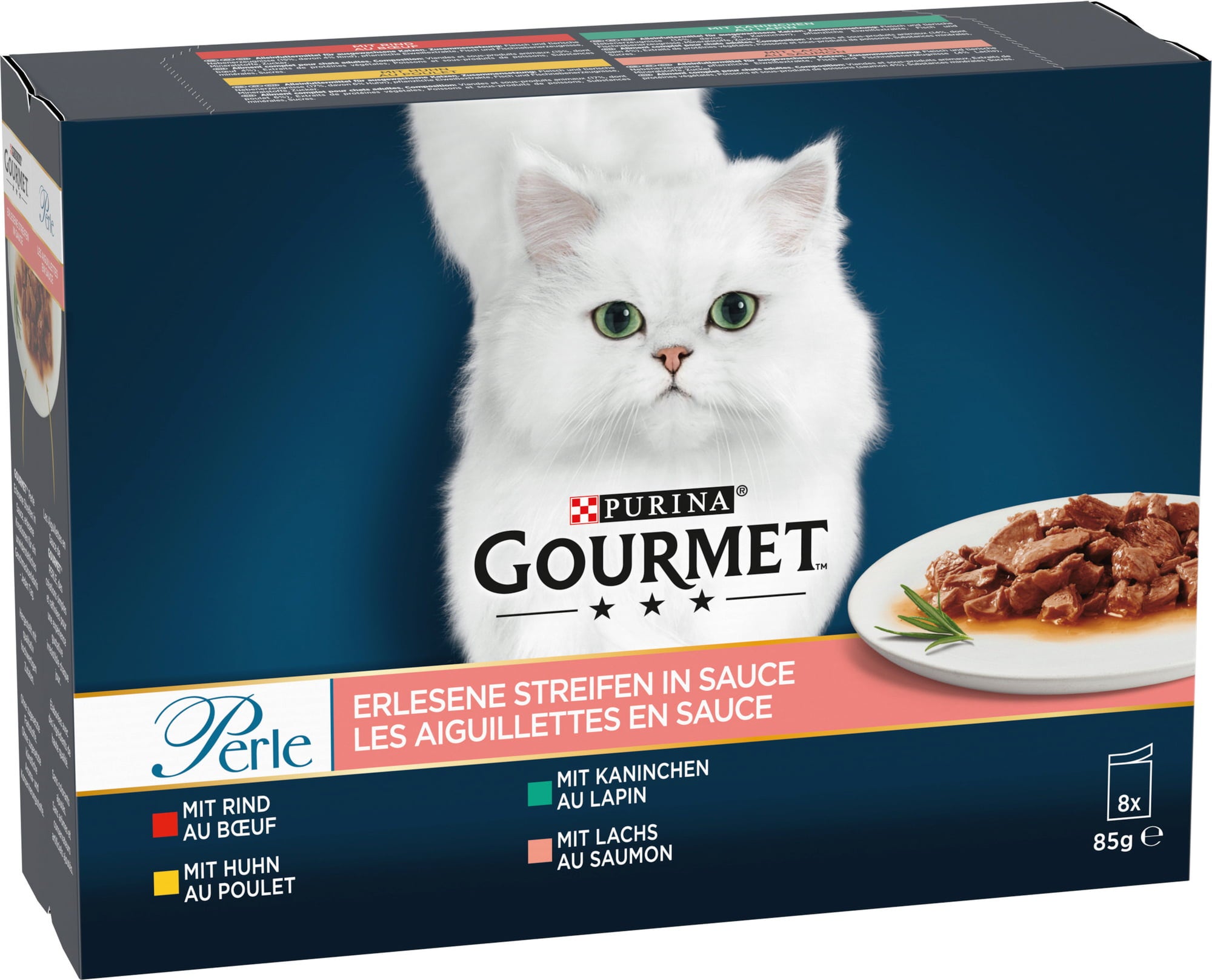 Gourmet Perle "Select Strips in Sauce" delights every cat with gently cooked strips served in a tasty sauce. The pack contains the following four flavours: