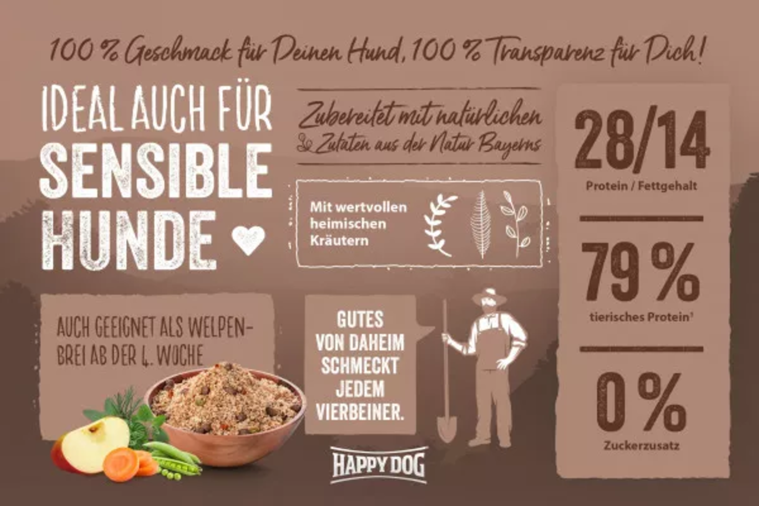 The mash is an excellent choice of food for pets with normal to slightly increased energy requirements and for puppies from 4 weeks of age. This easily digestible food is also ideal for nutritionally sensitive dogs with stomach and intestinal problems.