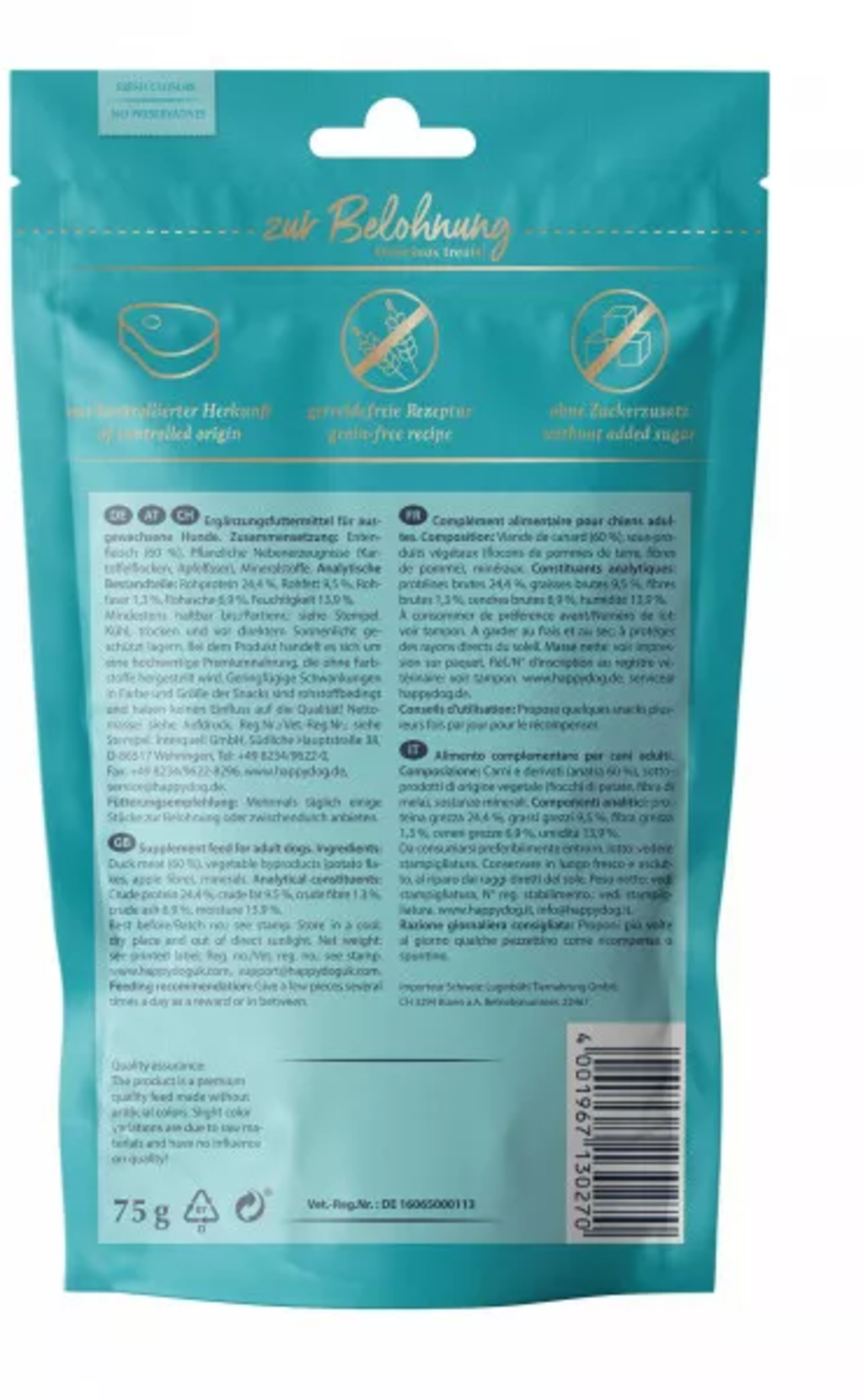 The high-quality duck meat used in the preparation of these snacks comes from transparent rearing in Germany. Sustainable production is a priority for Happy Dog!