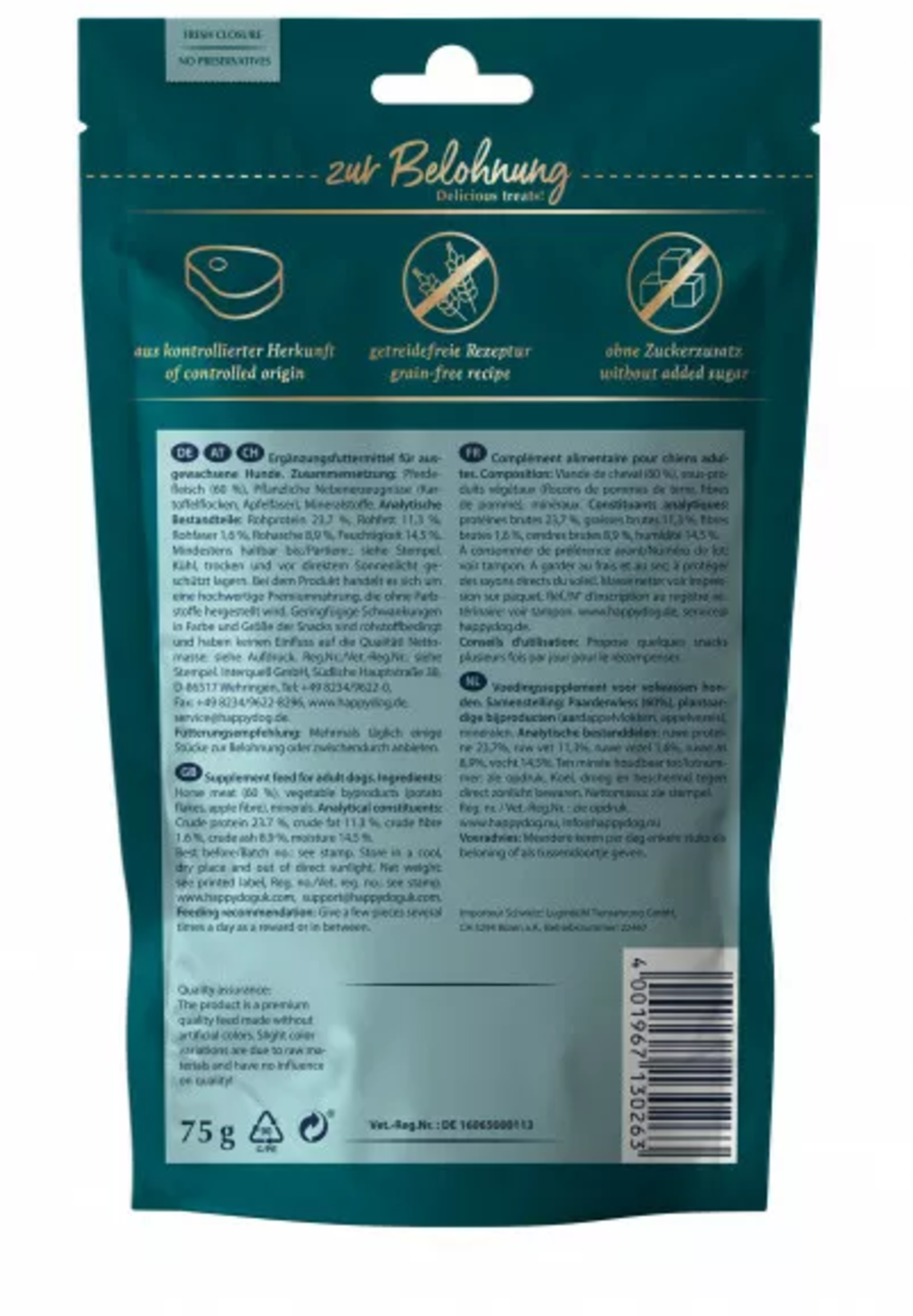 The high-quality horse meat used in the preparation of the snacks comes from transparent farms in Germany. Sustainable production is at the heart of Happy Dog!