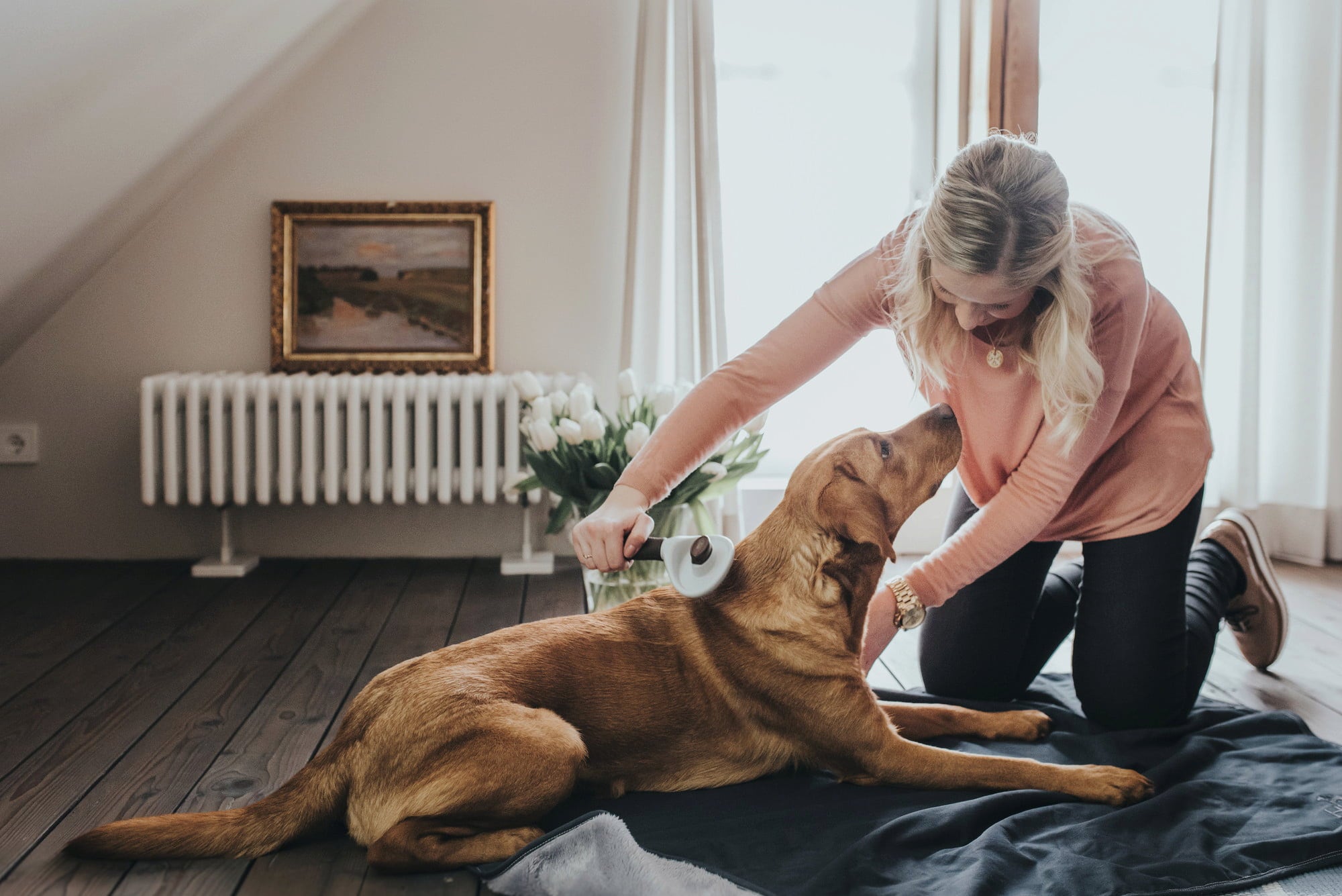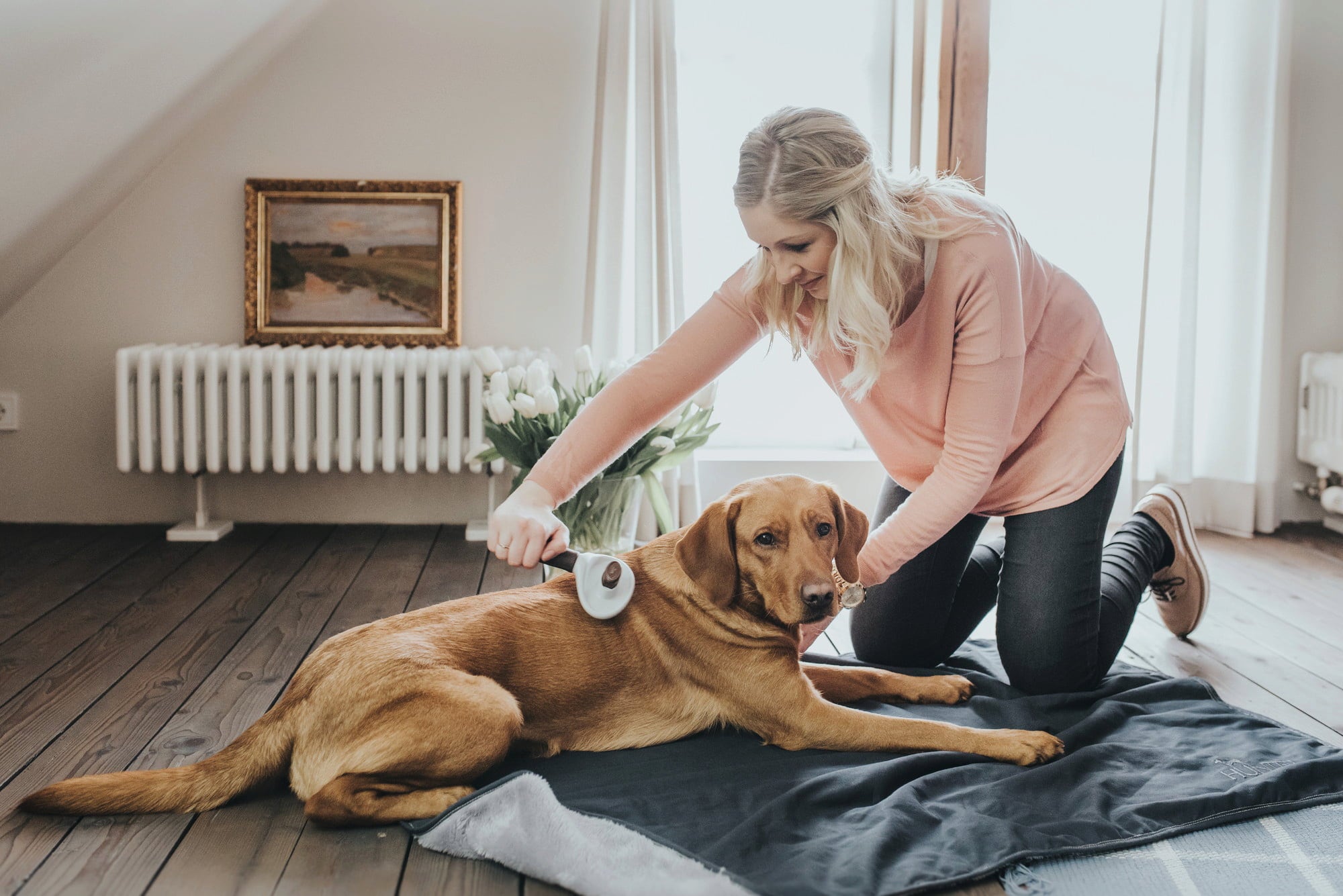 - Gentle removal of dead hair from the topcoat and undercoat