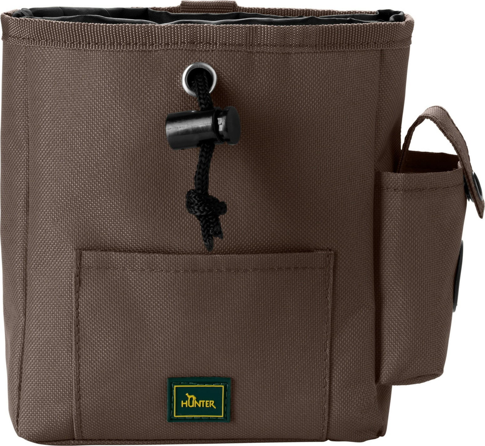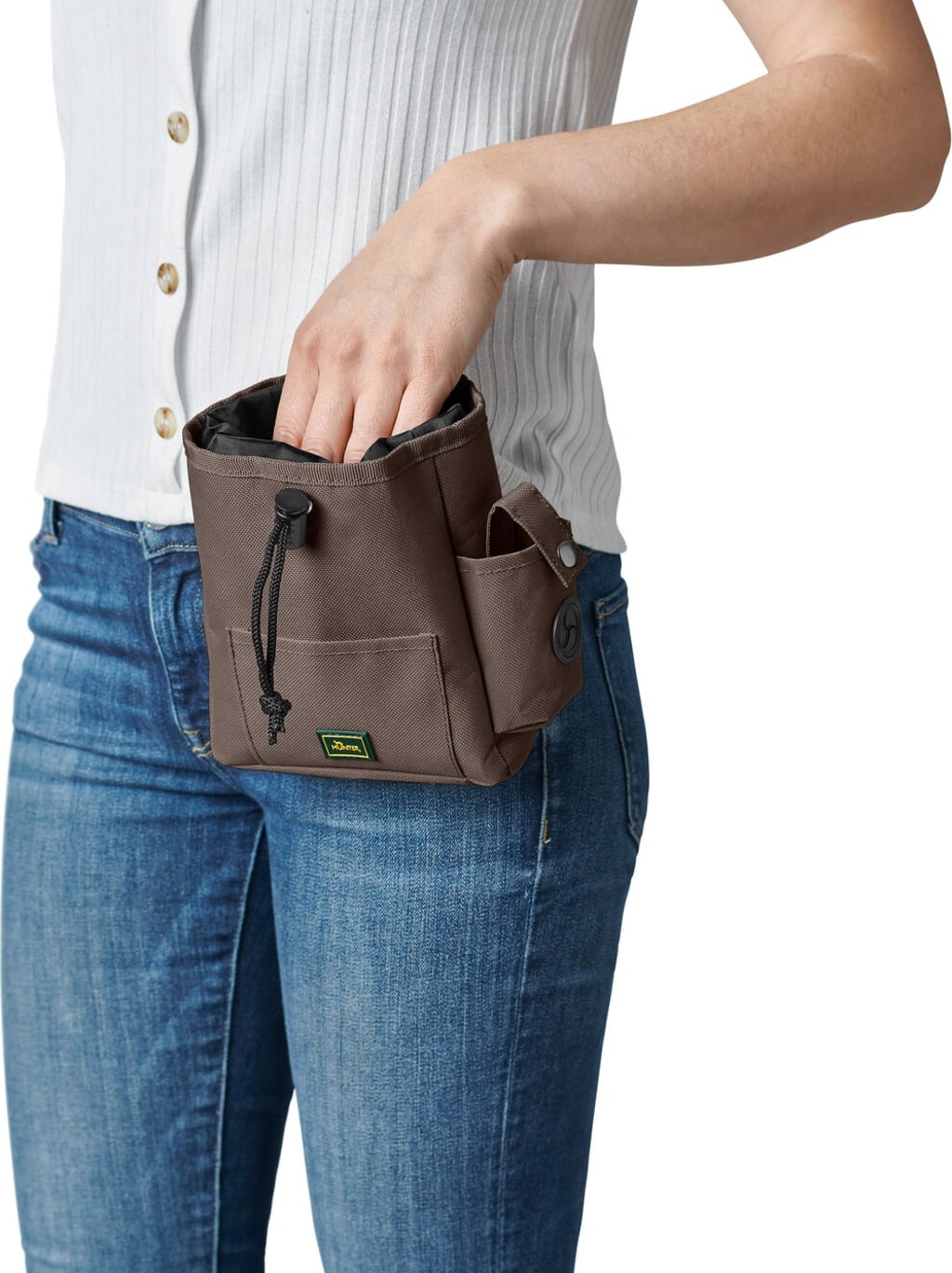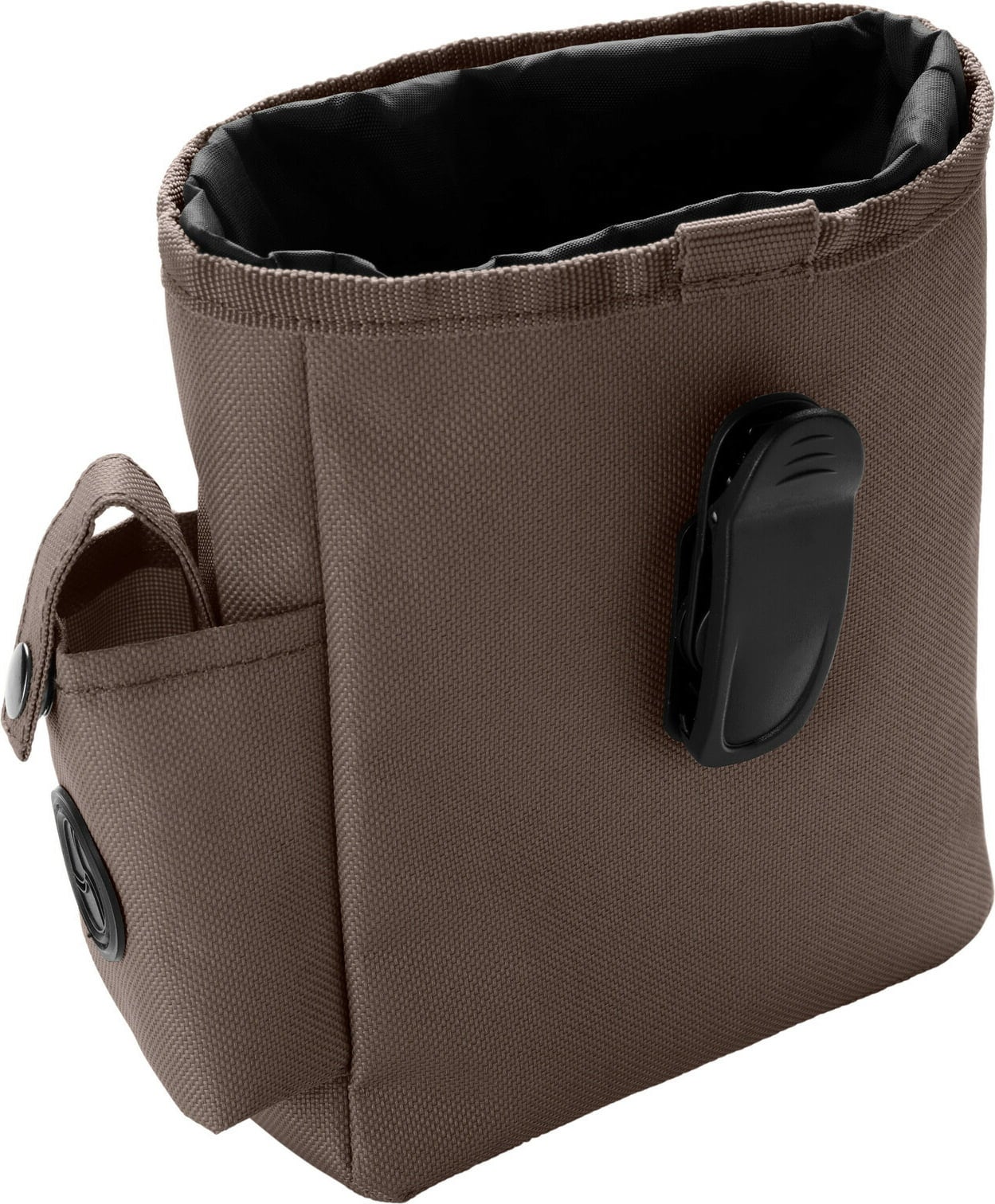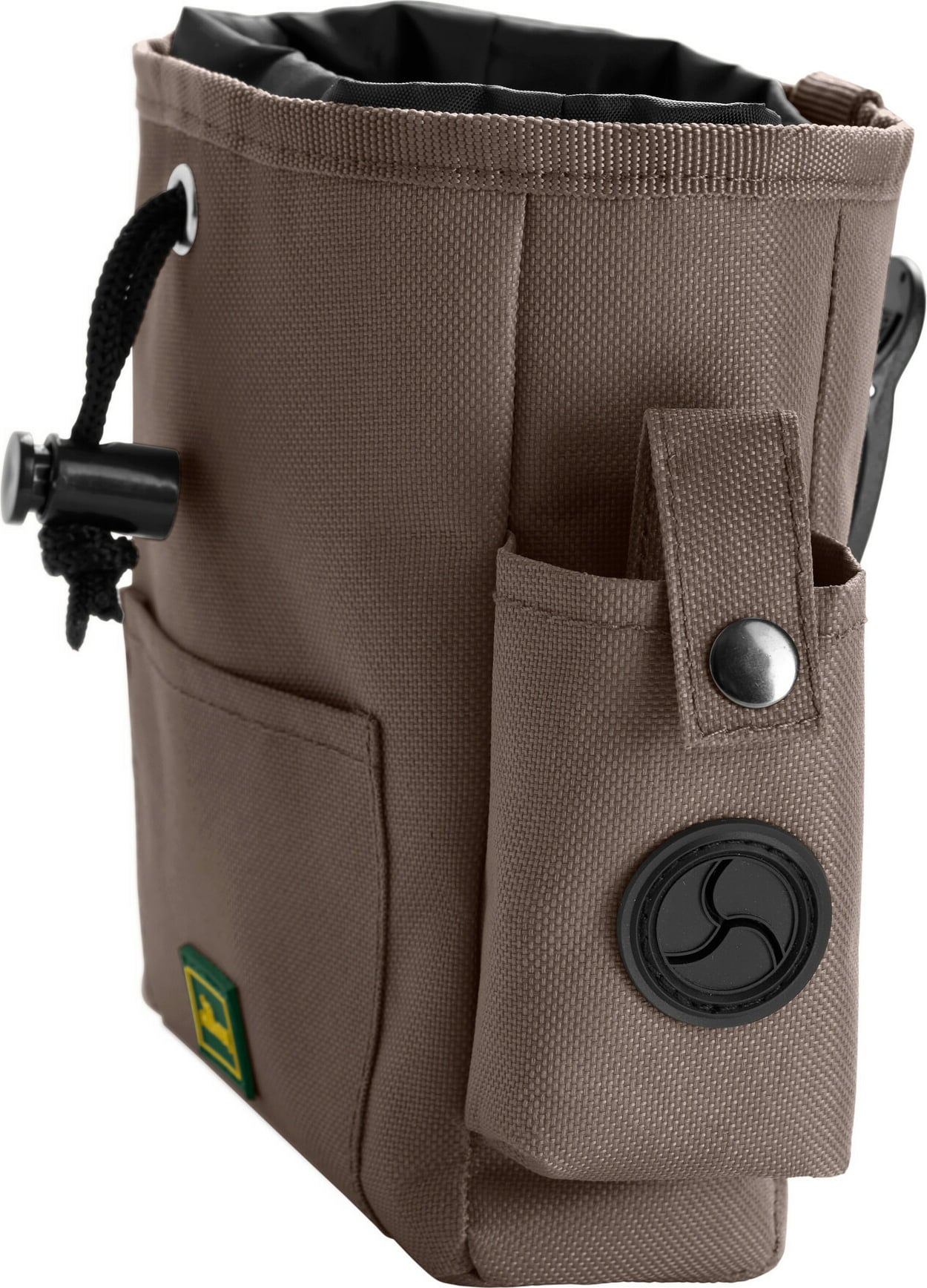 The exterior is crafted from durable, waterproof, recycled 600D polyester, ensuring that the contents remain fresh and easily accessible as a reward for your furry friend. The drawstring closure allows for quick opening and secure closing after use. Additionally, it features a built-in holder for poop bag rolls and a small pocket for items like clickers, helping you stay organised.