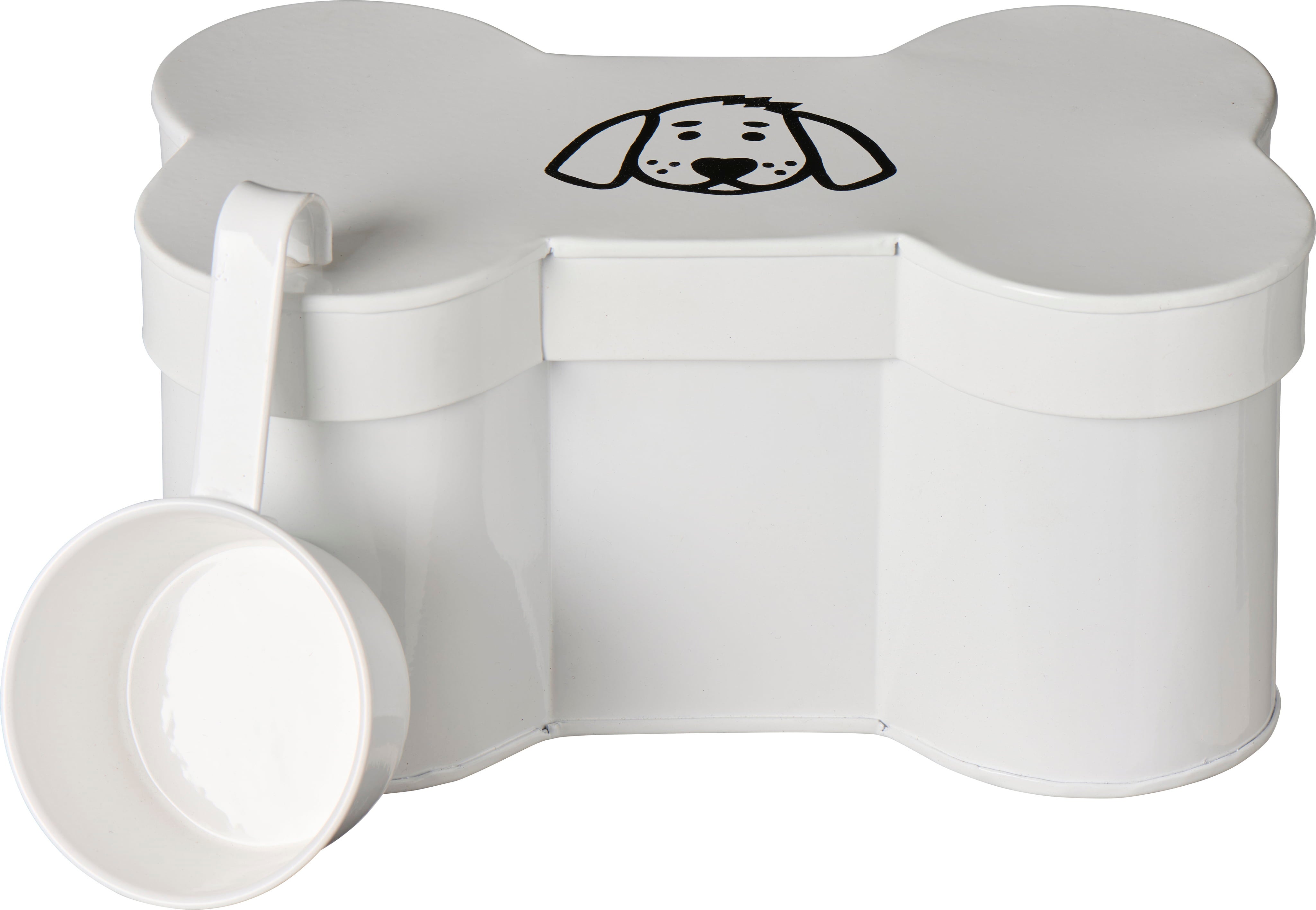 This adorable bone-shaped storage tin will preserve the aroma, crunchiness and freshness of dry dog food and treats. Plus, the enclosed measuring cup makes it easy to measure out the food.