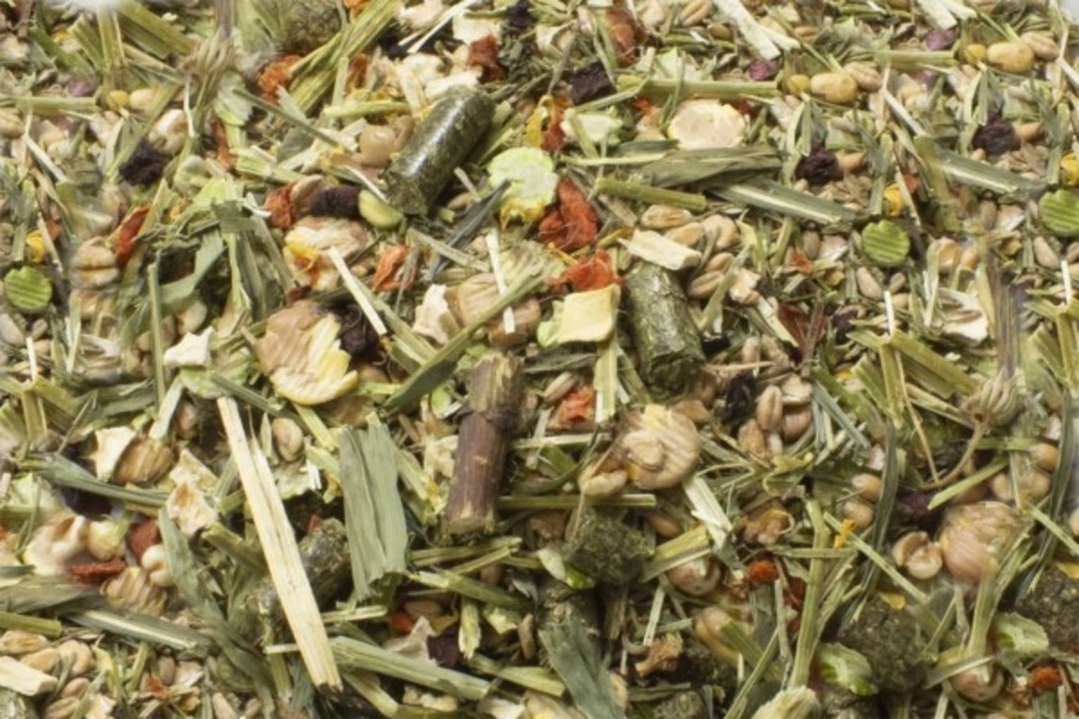 Products from the permanent grasslands in the Alpine foothills (consisting, among other things, of Timothy, Foxtail, Oat grass, Orchard grass, Oats, Poa pratensis, Red clover, Ranunculus acris, Vernal grass, Holcus lanatus, Golden oats, Vicia angustifolia, Medicago lupulina, Dandelion , Ribwort plantain, Primula veris, Daisy, Daisy, Greater burnet, Galium mollugo, Parsnips, Sorrel, Germander speedwell, Cerastium fontanum, German ryegrass, soft brome, Vicia cracca, Vicia sepium, Tridentate orchid, Ranunculus bulbosus, Rhinanthus minor, Anthriscus sylvestris, Yarrow), wheat, Pea flakes, Wheat Flakes, Alfalfa, Broad bean flakes, 5 % Parsley , Grass seed, Peppermint, Echinacea, Dried carrots, Beetroot, Corn plant, Parsnips, puffed wheat, Oats, 0,4 % Calendula flowers