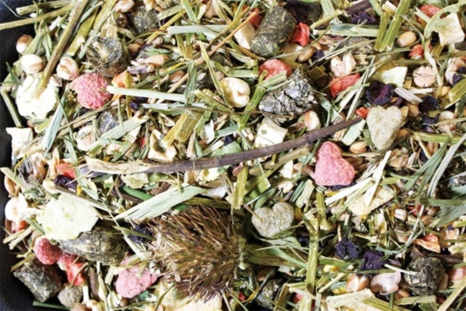 Products from the permanent grasslands in the Alpine foothills (consisting, among other things, of Timothy, Foxtail, Oat grass, Orchard grass, Oats, Poa pratensis, Red clover, Ranunculus acris, Vernal grass, Holcus lanatus, Golden oats, Vicia angustifolia, Medicago lupulina, Dandelion , Ribwort plantain, Primula veris, Daisy, Daisy, Greater burnet, Galium mollugo, Parsnips, Sorrel, Germander speedwell, Cerastium fontanum, German ryegrass, soft brome, Vicia cracca, Vicia sepium, Tridentate orchid, Ranunculus bulbosus, Rhinanthus minor, Anthriscus sylvestris, Yarrow), wheat, Pea flakes, Wheat Flakes, Alfalfa, Broad bean flakes, 5 % Parsley , Grass seed, Peppermint, Echinacea, Dried carrots, Beetroot, Corn plant, Parsnips, puffed wheat, Oats, 0,4 % Calendula flowers