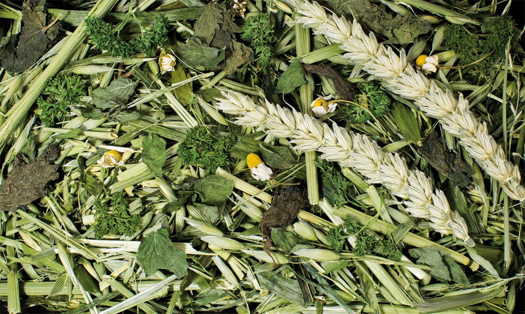 Oat plant, 20 % Parsley , Alfalfa, wheat plant, 7,7 % Nettle, Lemon balm, Dandelion , Mountain meadow hay, 2,3 % Peppermint, 1,2 % Chamomile flowers