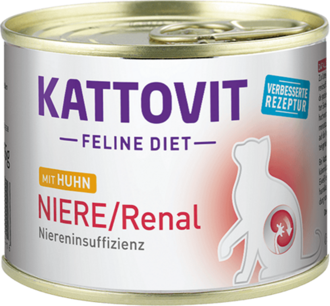 This premium dietary complete pet food with tasty chicken pieces adheres to the latest scientific standards and has been specifically developed for cats with chronic kidney insufficiency. Thanks to its formulation with low protein content in relation to energy level, it can support normal kidney function and overall well-being of your cat.