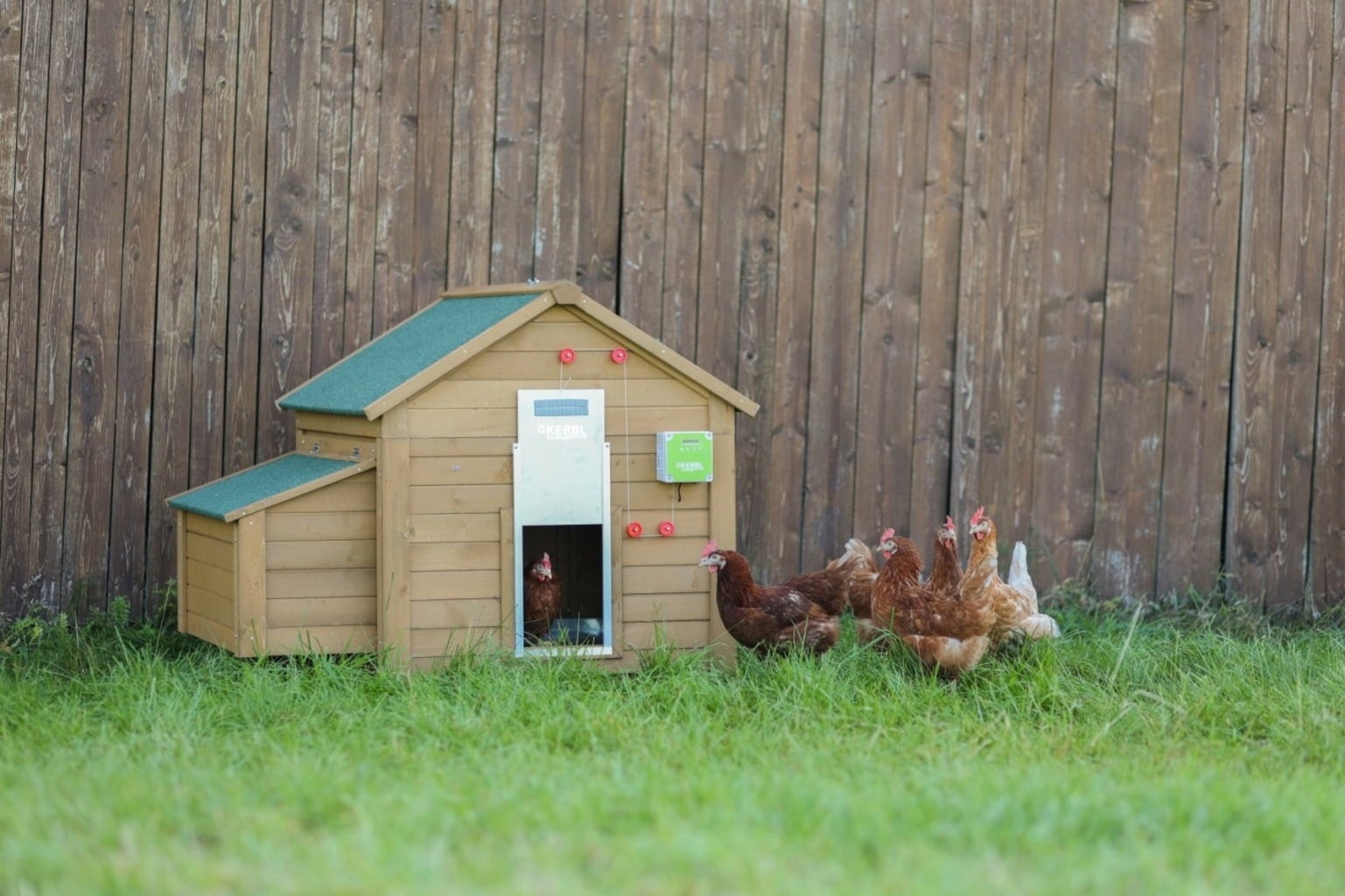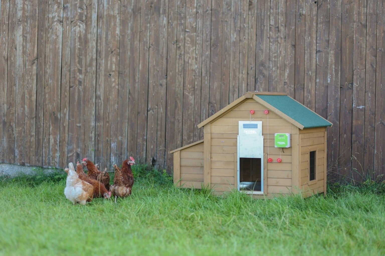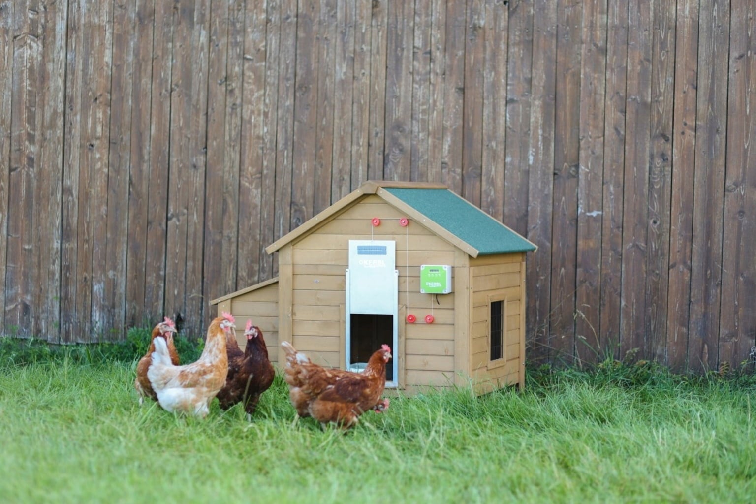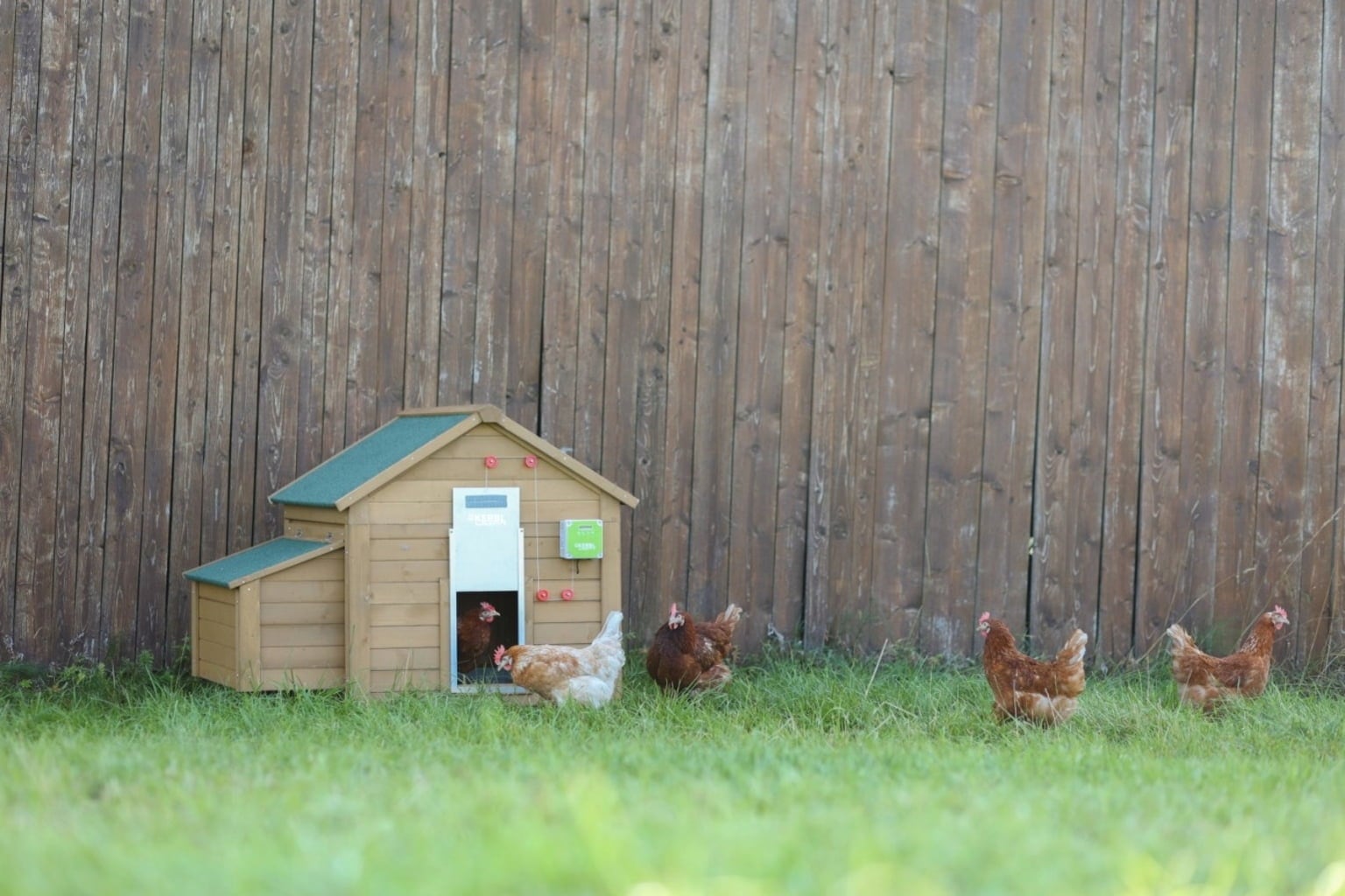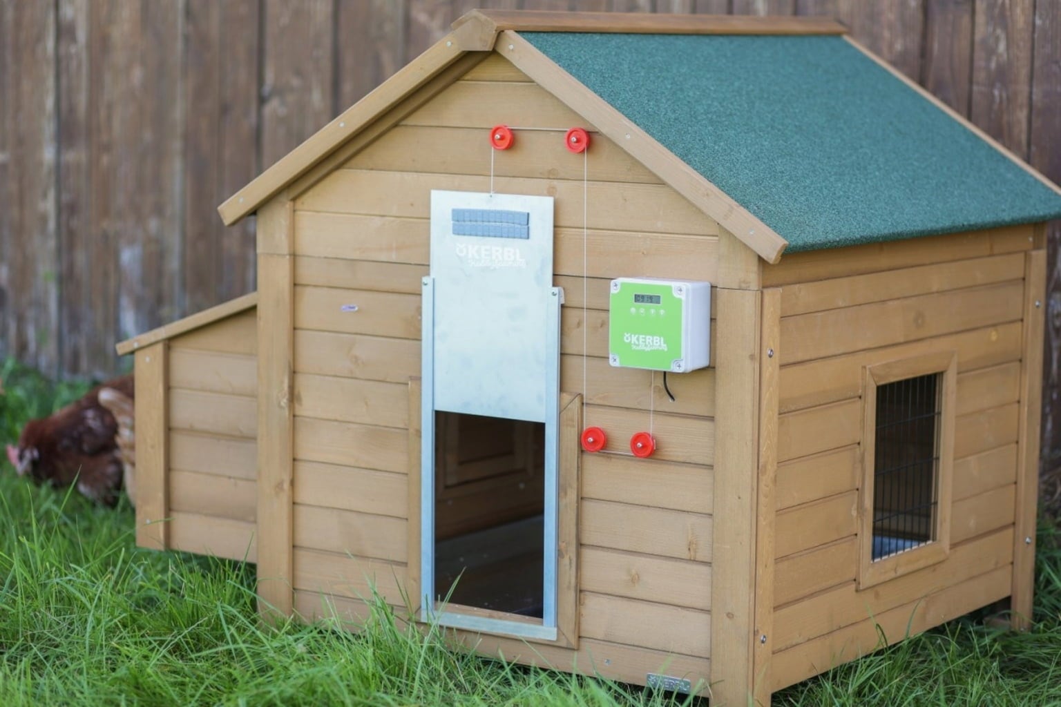 This automatic chicken sliding door can be opened and closed based on daylight and time.