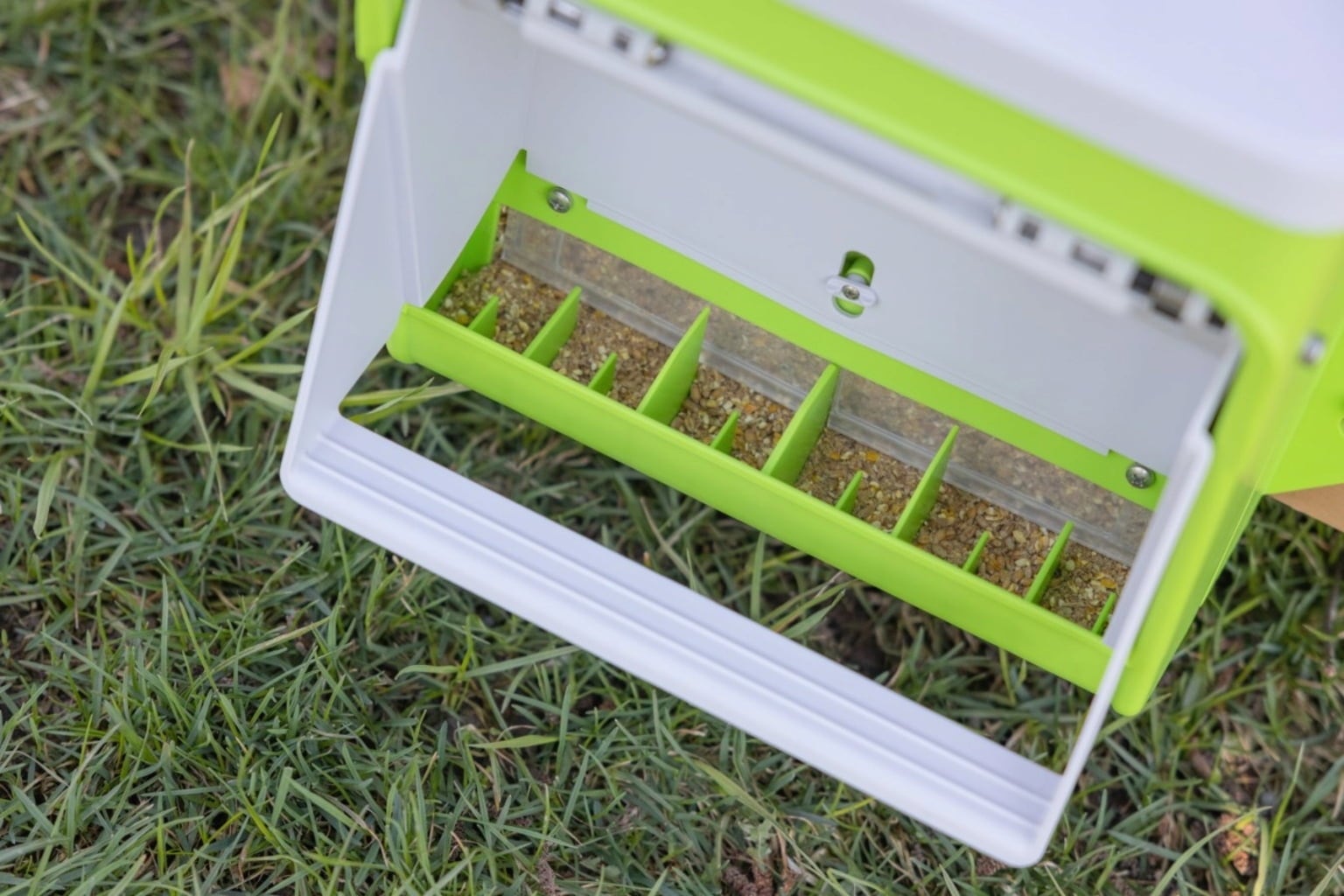 When a chicken steps on the treadle, the flap opens, allowing the chicken to feed. Once the chicken leaves the treadle, the flap closes again. Thanks to the spring mechanism, chickens can easily activate the elevated treadle, which is barely accessible to other animals.