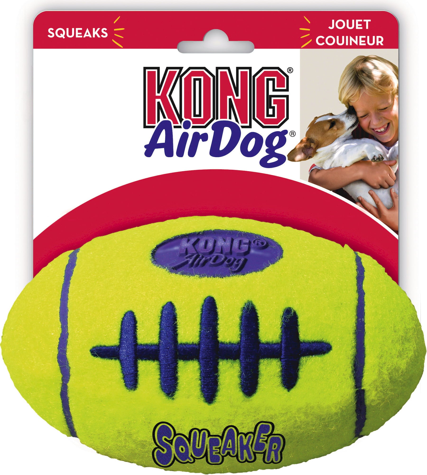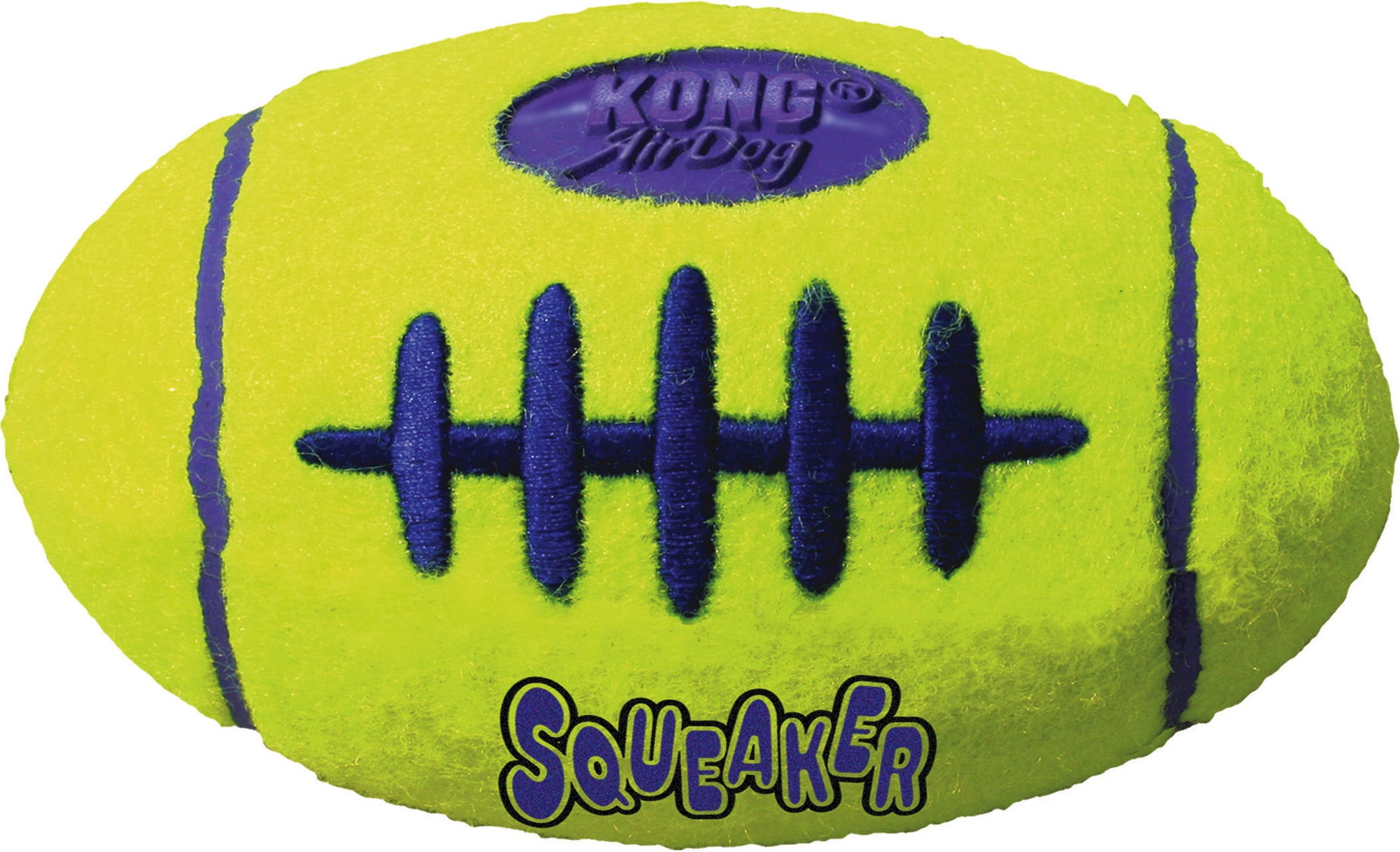 If your loyal pet and you love retrieval games, throwing and catching are among your favourite activities, then the KONG® AirDog® Squeaker Football is perfect for you! While the toy's neon yellow felt surface might remind you of a tennis ball, it’s designed to be non-abrasive, protecting your dog’s teeth and gums.