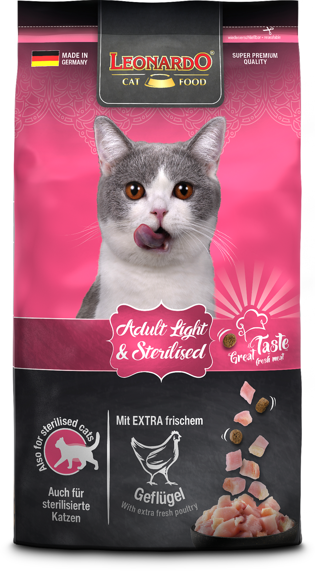Adult Light & Sterilised dry food is an energy-reduced pet food with high protein content, combining delicious poultry meat with valuable krill and chia seeds.