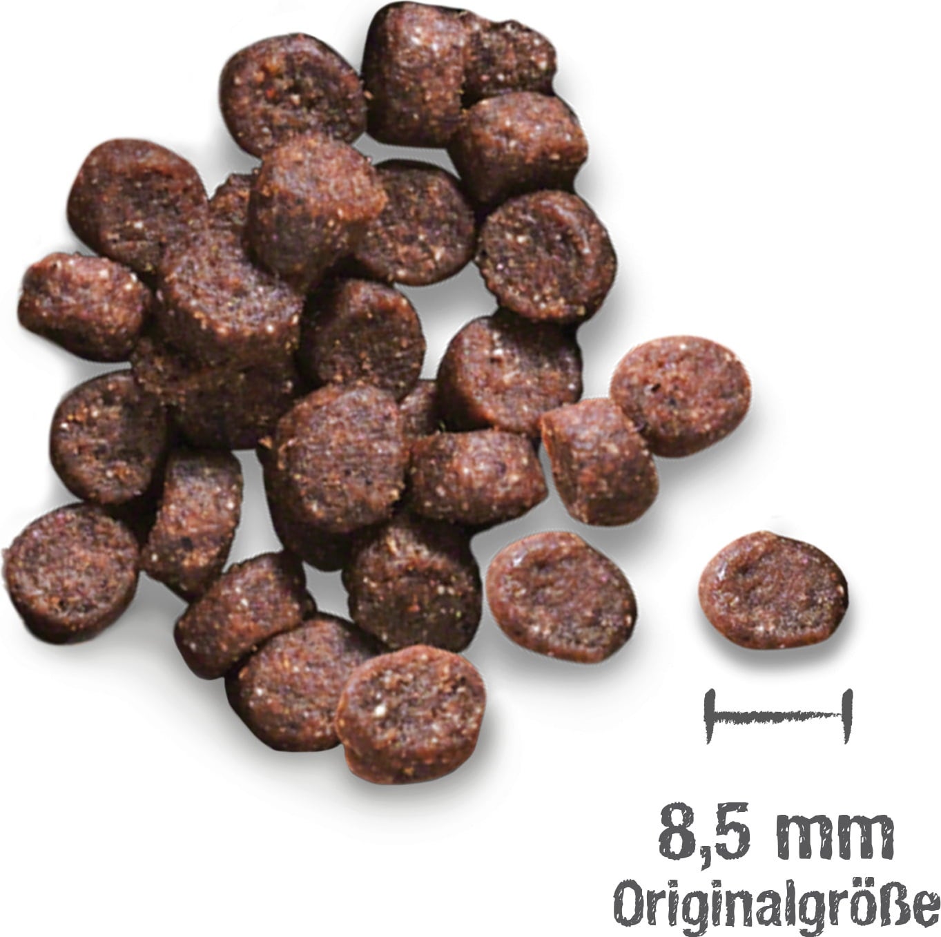 30 % Fresh poultry meat, 22 % Low-ash dried poultry protein, 15 % Amaranth, Potato starch, Pea flour, Poultry fat, Hydrolysed poultry liver, Ground marine zooplankton (2,5 % Krill), 2,5 % Fish meal from sea fish, 2,5 % Inactivated and dried brewer's yeast, Dried egg, Grape seed expeller, 1,3 % Chia seeds, Dried carob meal, Sodium chloride, Potassium chloride, Dicalcium phosphate, Chicory inulin