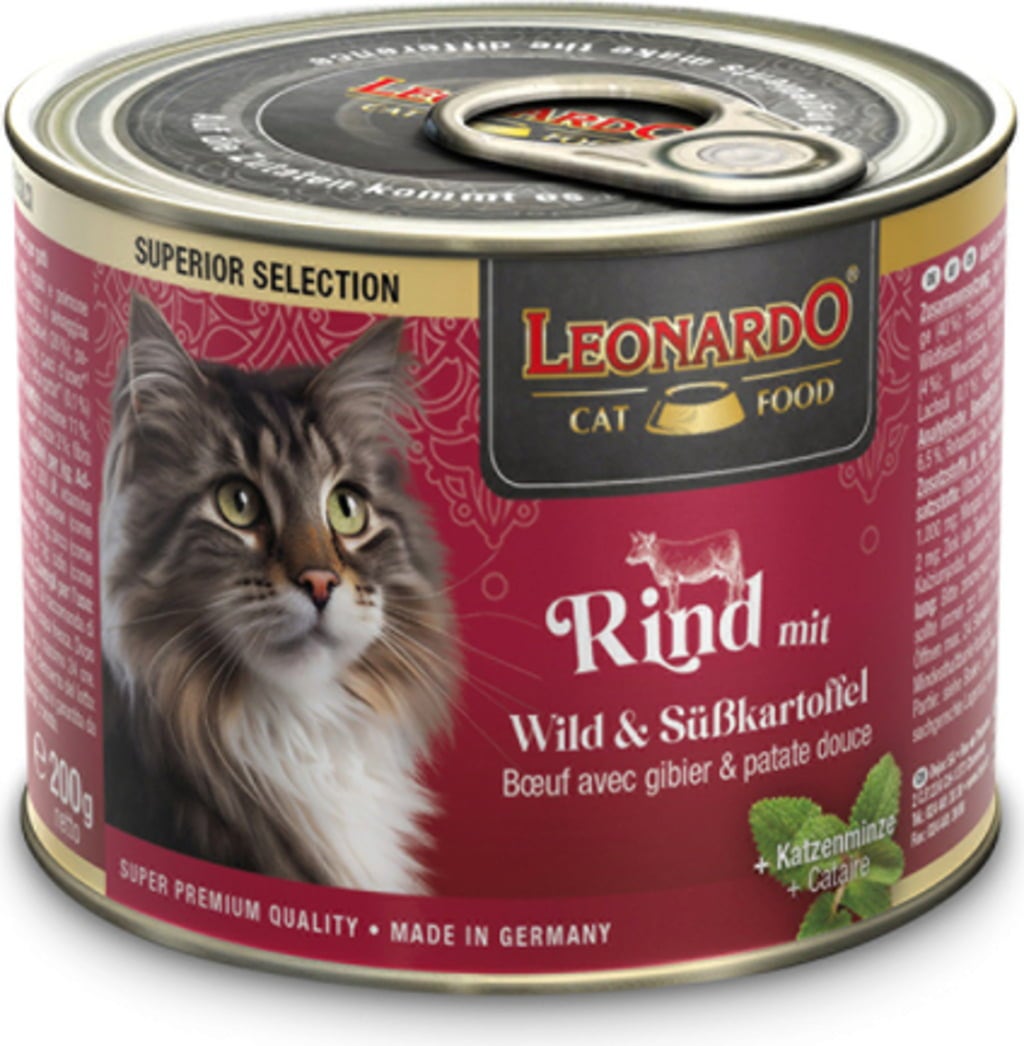 The Superior Selection by Leonardo is a delicious canned cat food featuring lean beef and offal combined with aromatic game meat (venison and wild boar). This delectable food is perfected with creamy sweet potatoes, making it a meal to fall in love with.