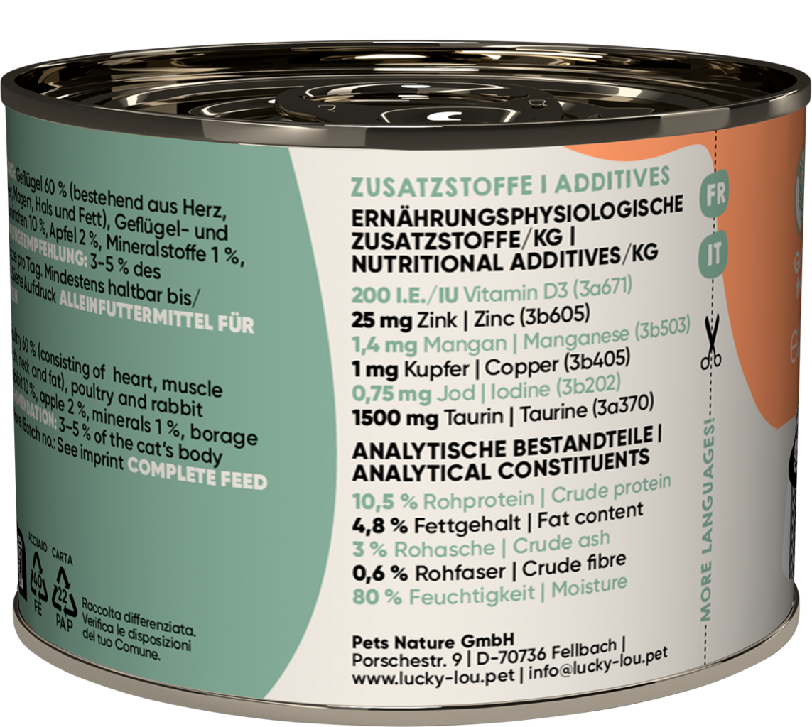 60 % Poultry (Heart, Muscle meat, Liver, Stomach, Neck, Fat), 26,8 % Poultry and rabbit broth, 10 % Rabbit, 2 % Apples, 1 % Minerals, 0,2 % Borage oil