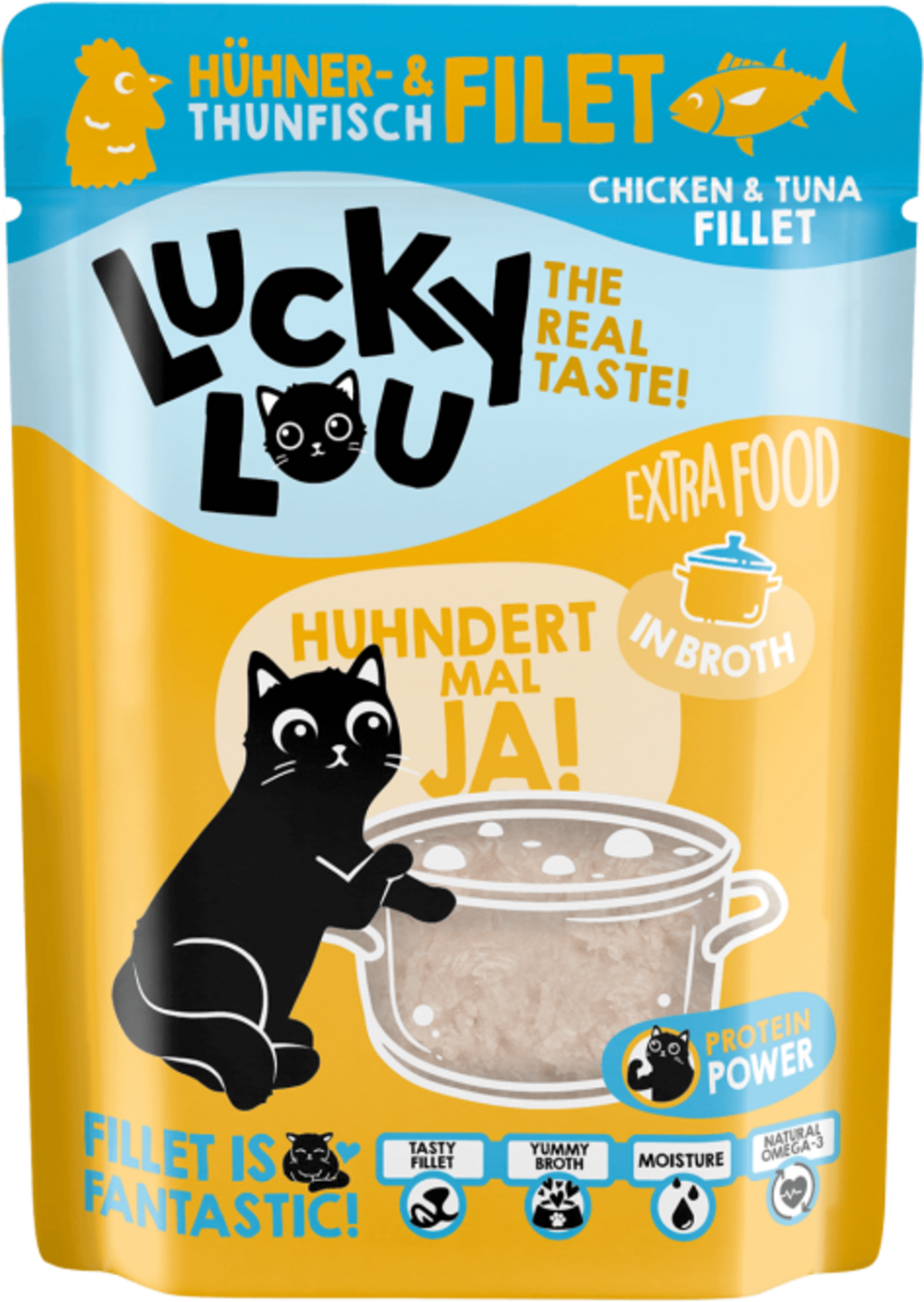 English reviews written for Lucky Lou Extra Food Pouch Chicken/Tuna Fillet in Broth