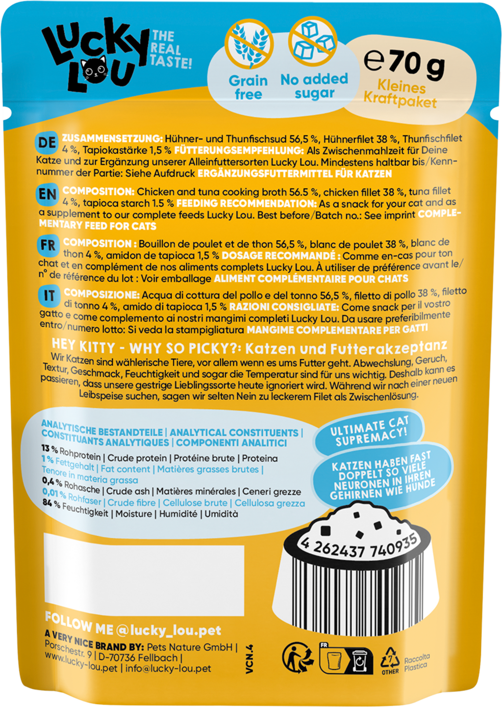 Sometimes, a little extra is needed - so why not treat your cat too? With this exquisite delicacy, you can truly pamper your cat and enhance their daily menu. Naturally, all varieties are perfectly cat-appropriate and made with the finest ingredients, allowing this extra food to be enjoyed with peace of mind.