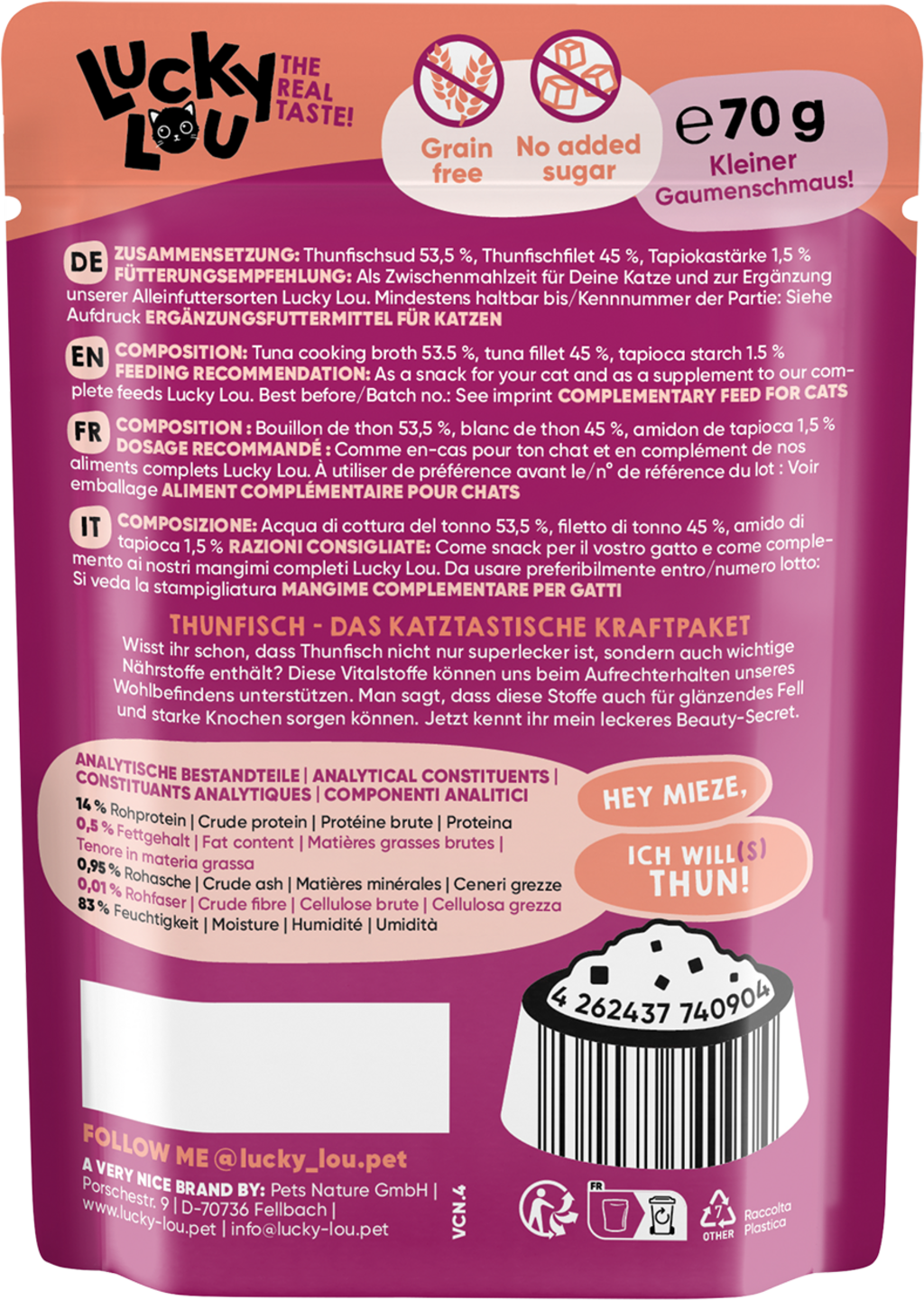 English reviews written for Lucky Lou Extra food pouch tuna fillet in broth