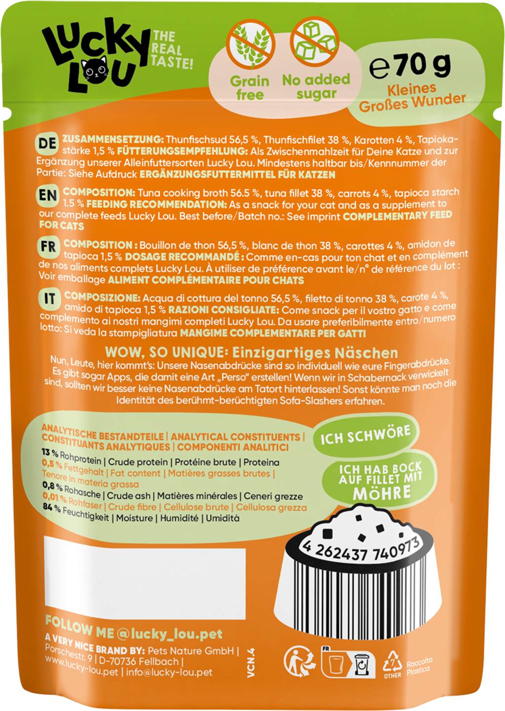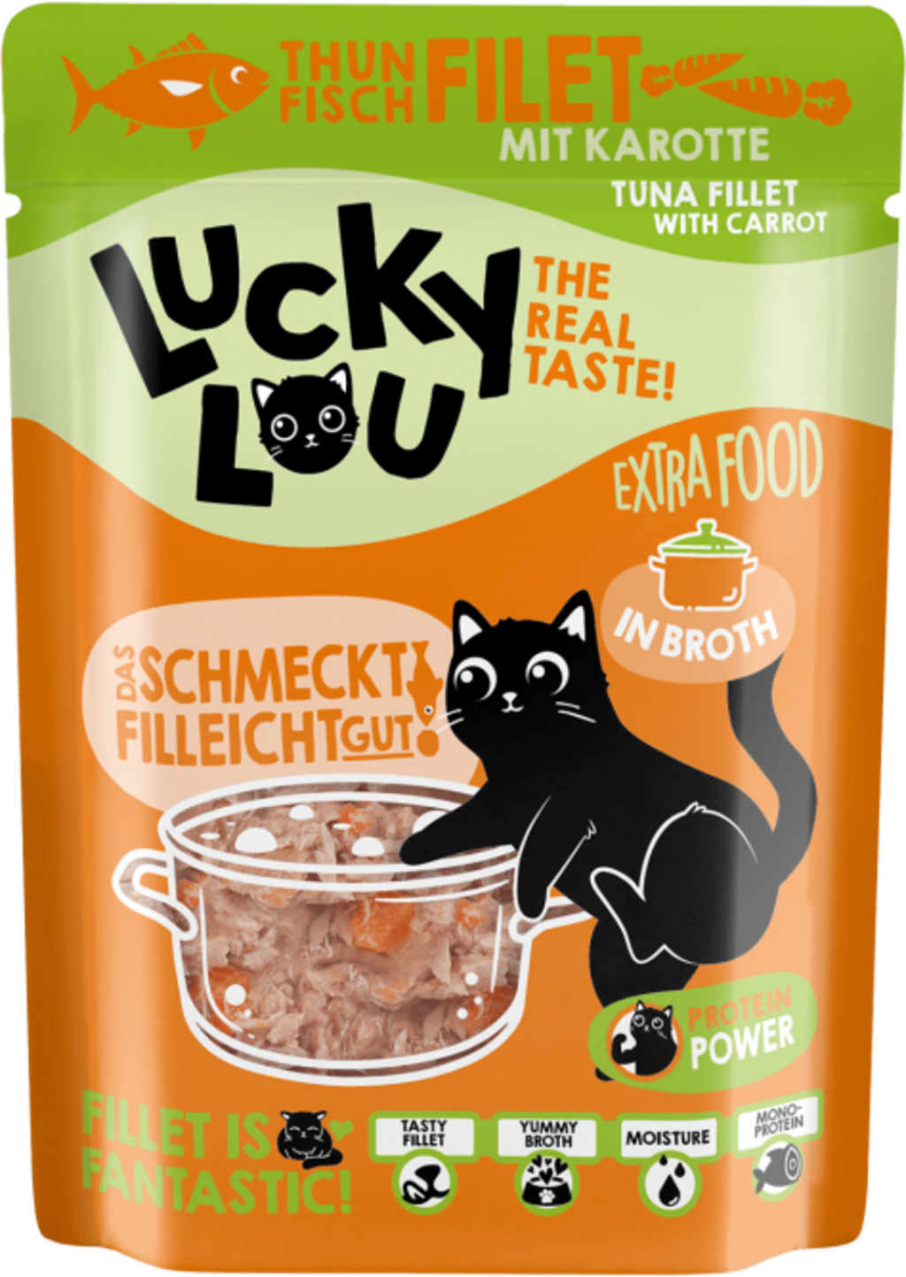 English reviews written for Lucky Lou Extra food pouch tuna with carrot in broth