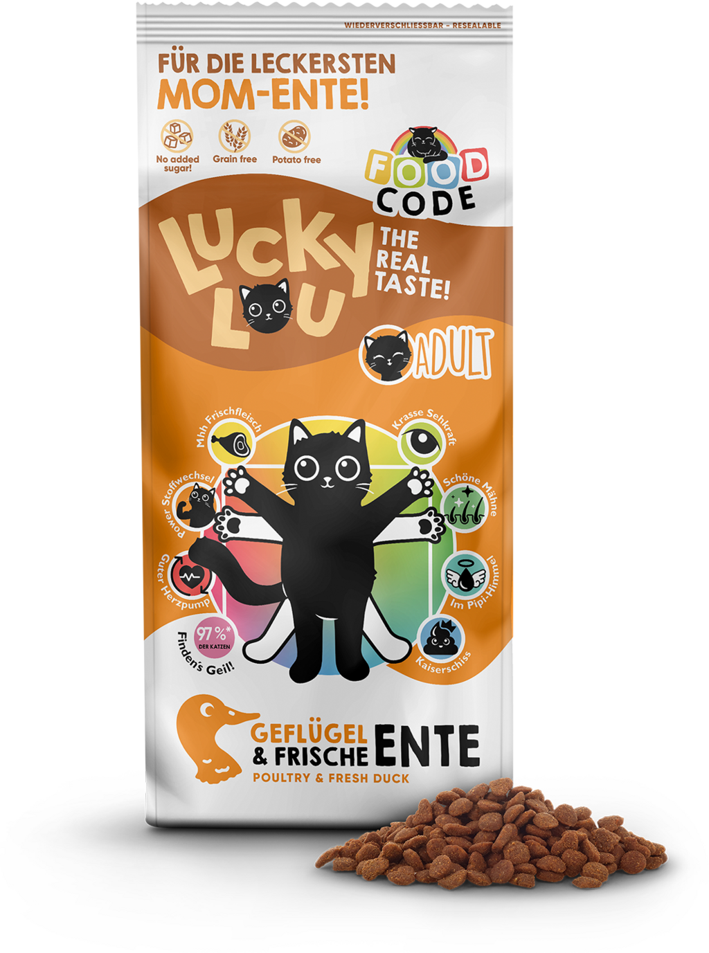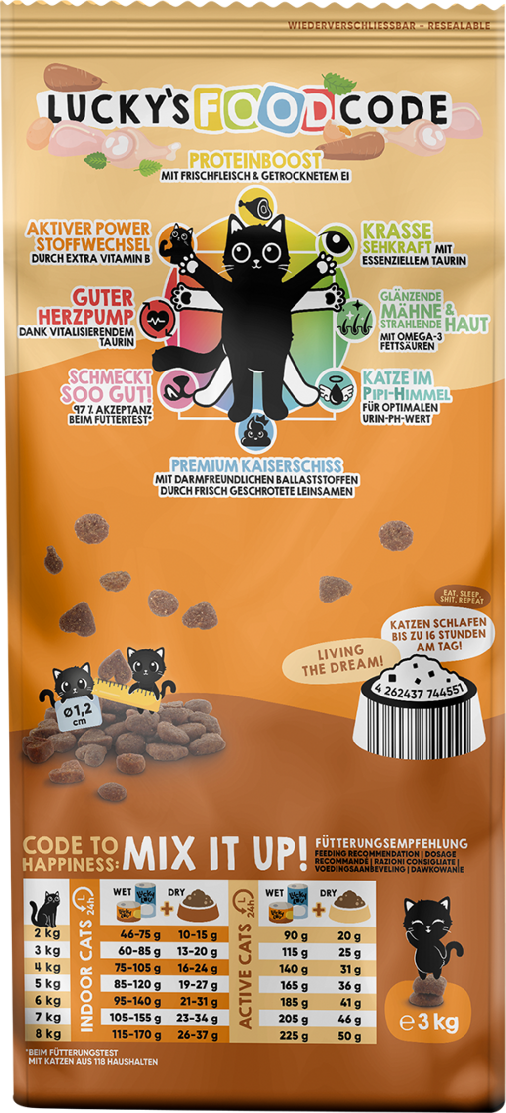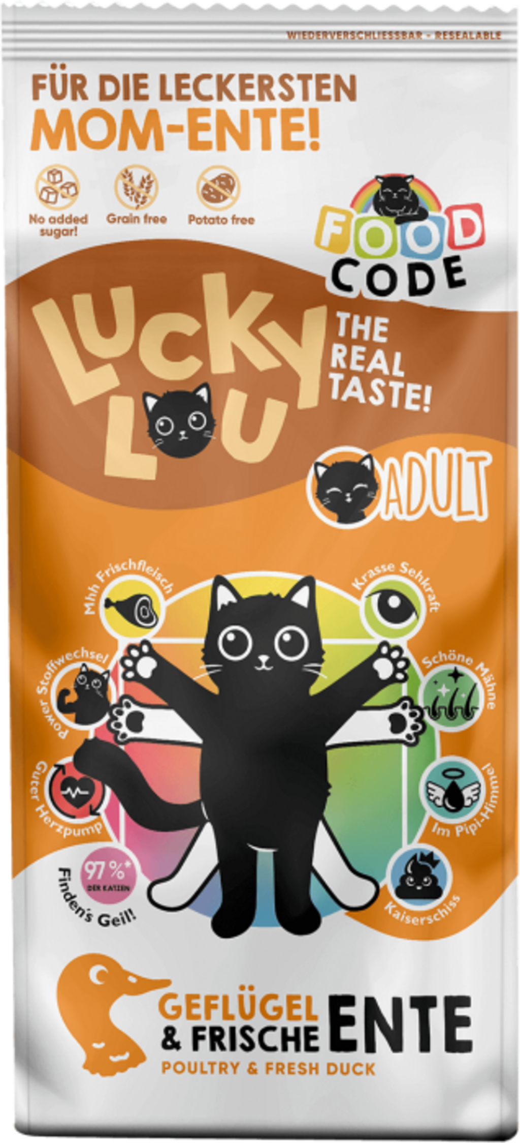 Lucky Lou Food Code is peak dry pet food, as it's not only irresistibly crunchy and delicious, but also provides your cat with valuable age-appropriate nutrients. Inspired by the perfect proportions of Leonardo da Vinci's Vitruvian Man, the balanced formula of this dry food offers 8 benefits per type, which holistically pamper your cat from head to paw.