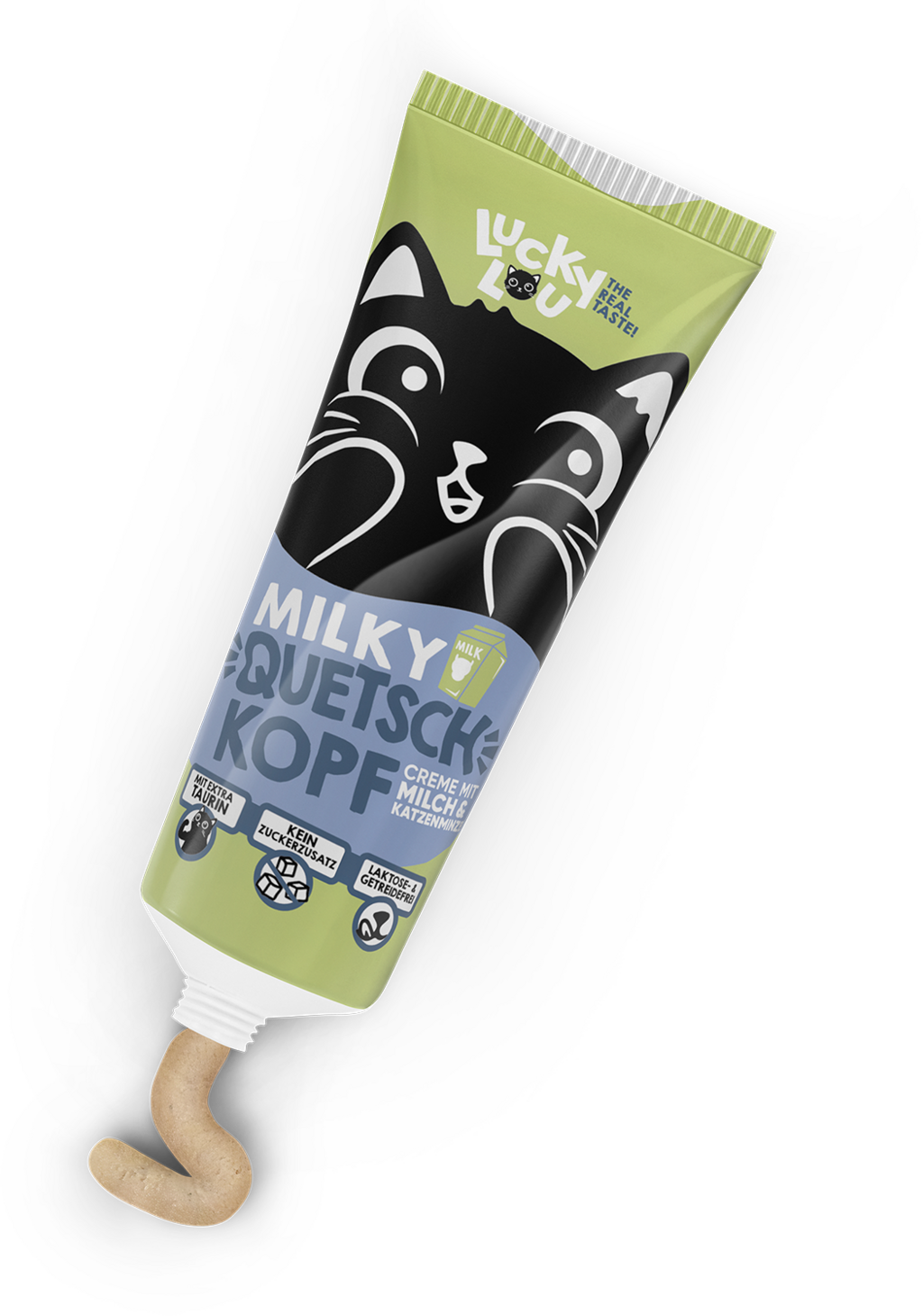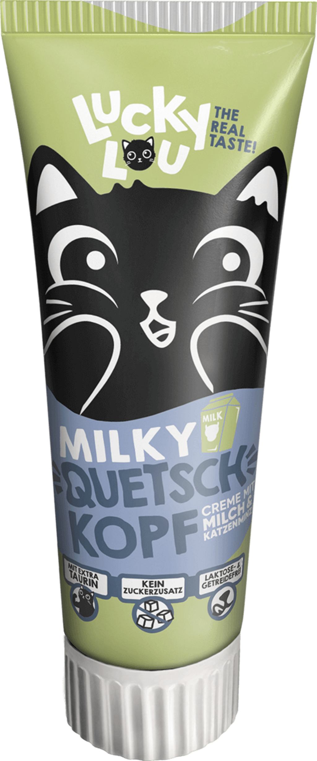 Squeeze head, not chatterbox! Inside this tube is a delicious snack paste that is not only irresistibly tasty but also provides your cat with numerous important vitamins as well as taurine and malt for the anti-hairball effect. Whether fed by hand or as a topping on the main food, Lucky Lou Squeeze Heads should be a staple on your cat's menu.