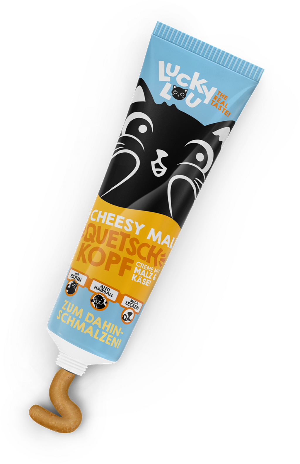 Quetschkopf, not Quatschkopf! This tube contains a delicious snack paste that's not only irresistibly tasty but also supplies your cat with numerous essential vitamins, as well as taurine and malt for an anti-hairball effect. Whether fed from the hand or as a topping on the main meal, Lucky Lou Quetschköpfe should not be missing from your cat's menu.