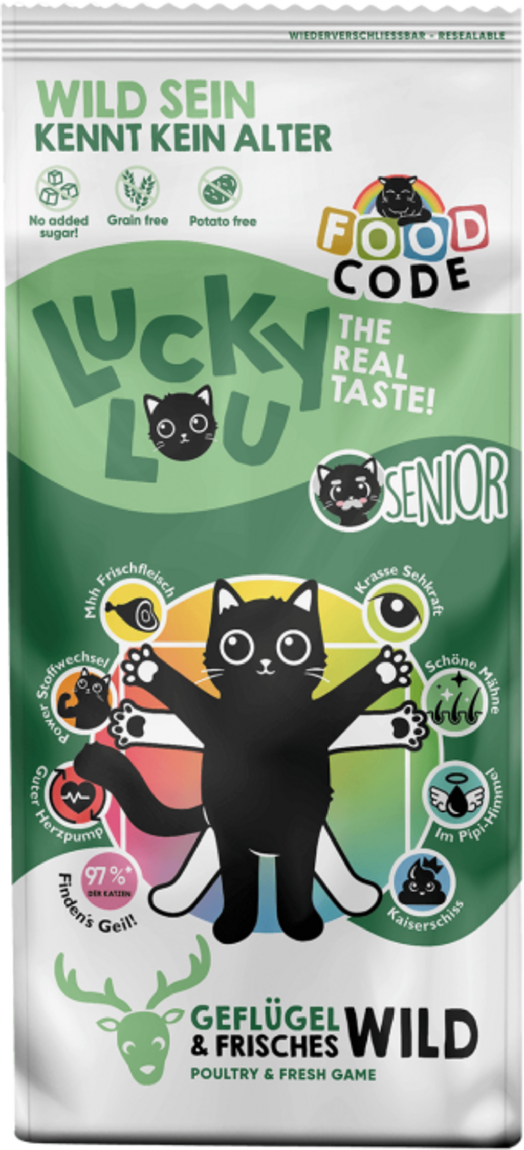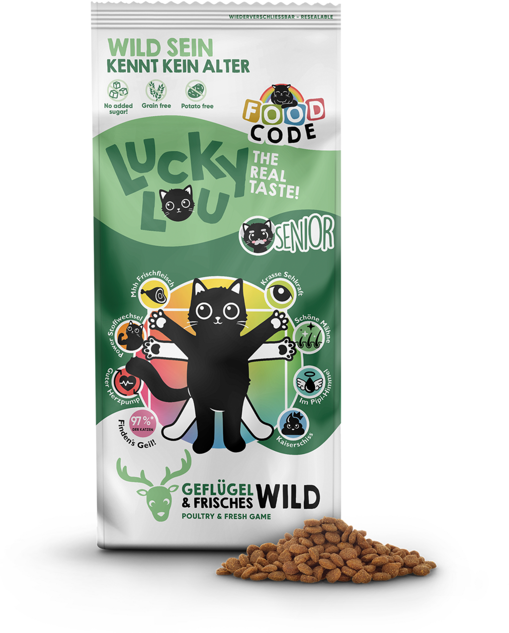 Lucky Lou Food Code is peak dry pet food, as it not only tastes irresistibly crunchy and delicious but also provides your cat with age-appropriate valuable nutrients. Inspired by the perfect proportions of Leonardo da Vinci's Vitruvian Man, the balanced recipe of this dry pet food offers 8 benefits per variety, which holistically pamper your senior cat from head to paw.