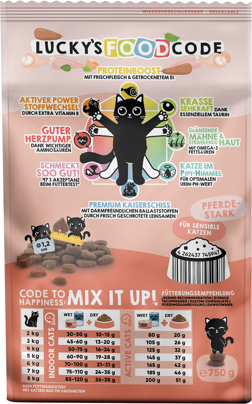 Lucky Lou Food Code stands for peak dry food, as it not only tastes irresistibly crunchy and delicious, but also provides your cat with valuable nutrients suitable for their age. Inspired by the perfect proportions of Leonardo da Vinci's Vitruvian Man, the balanced recipe of this dry food offers 8 benefits per variety, which thoroughly pamper your cat from head to toe.