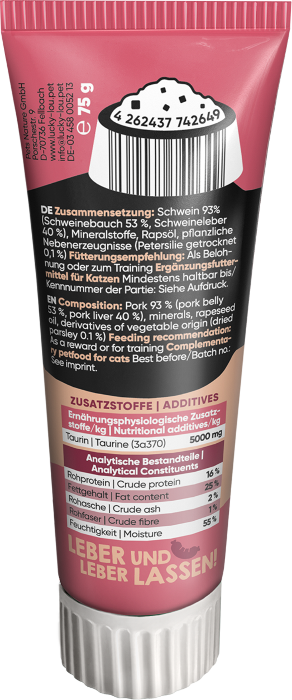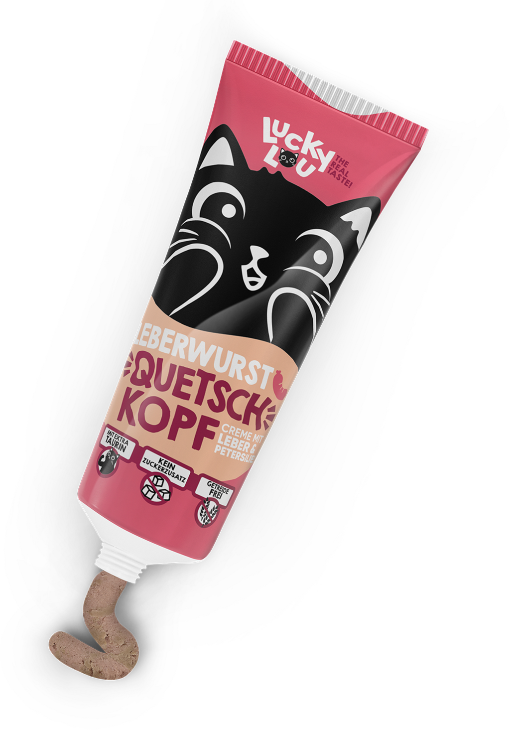 Squeeze cap instead of daft cap! This tube contains a delicious snack paste that not only tastes irresistibly scrumptious, but also provides your cat with numerous important vitamins as well as taurine and malt for the anti-hairball effect. Whether fed by hand or as a topping on main pet food, Lucky Lou squeeze caps should not be missing from your cat's menu.