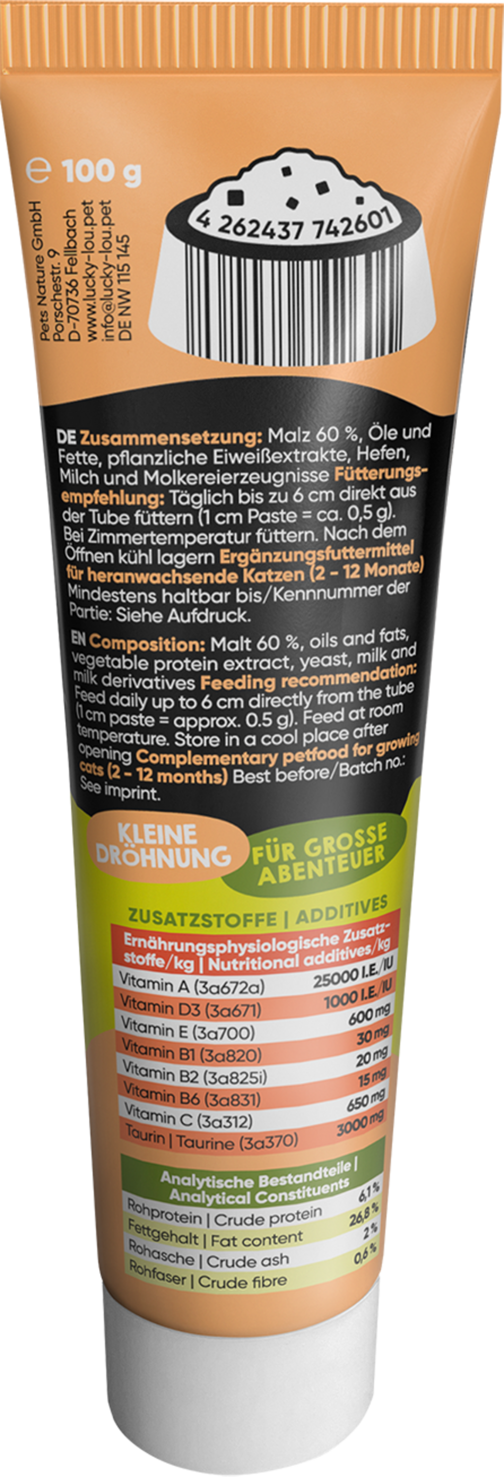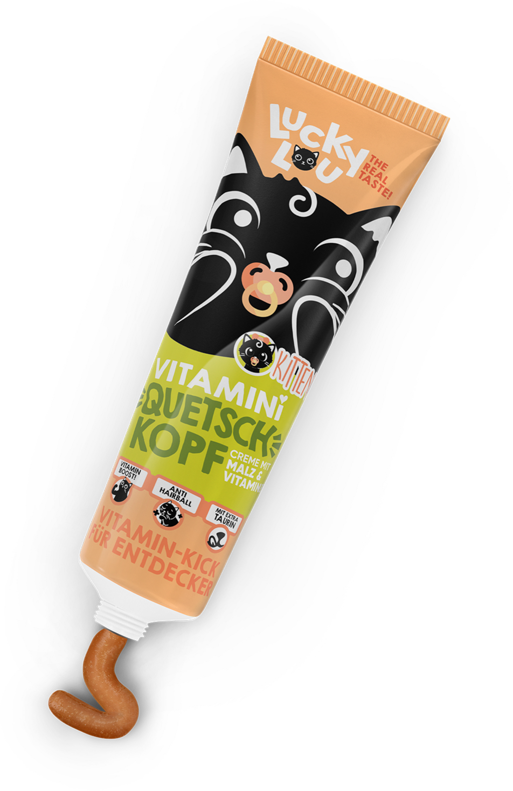 Squeeze head instead of nonsense head! This tube contains a delicious snack paste that not only tastes irresistibly delicious but also provides your cat with numerous essential vitamins, along with taurine and malt for the anti-hairball effect, right from the start. Whether fed by hand or as a topping on the main meal, Lucky Lou Squeeze Heads should not be missing from your cat’s menu.